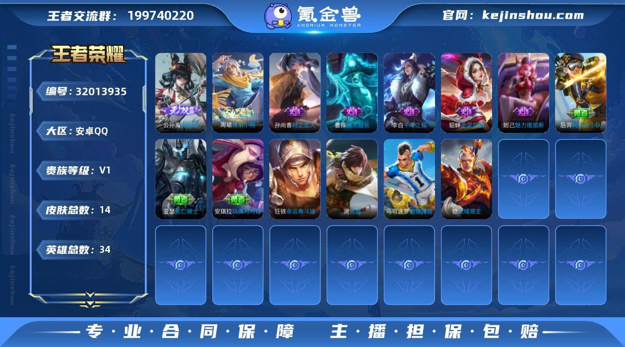 贵族等级:V1 典藏皮肤数:0 珍品无双皮肤数:0 无双皮肤数:1 珍品传说皮肤数:0 传说皮肤数:0 史诗皮肤数:5 皮肤数:14 英雄数:34 段位:星耀 卖家说:公孙离无双小号 纯新号 目前战力4500,表现分已经打满了 注册了不到一个月 欢迎来咨询 价格合适可以出!有专属按键