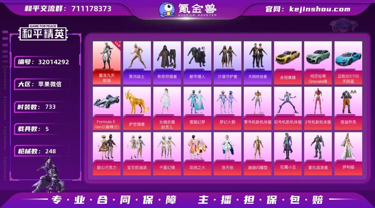 【特价出售】苹果V-1红装8稀有5载具20粉装22特效枪23热门188套装248枪皮 104756热力值 14印记 历史无敌战神 【1红装】 墨龙九天-敖渊 (2级) 【8稀有】 木乃伊 奇异狩猎者 M416-星际漫游 AKM-缤纷海域 AKM-百万伏特 都市猎人 浪漫天命 天网终结者 【5载具】 玛莎拉蒂G绿色 迈凯伦570S天际蓝 Formula(巅峰兰) 永恒黄蜂 护世瑞兽 【20粉装】 红螳螂 黄螳螂 紫螳螂 梦幻火箭 雪国幻梦 萨利娅 赵灵儿 宝贝奶油派 甜心巧克力 狂魇小丑 洛天依 怪诞乔克 数码大师 启明星 花间之火 千面幻镜 星之彼岸 音爆索尼克 闪耀迪迦型 复仇流浪者 【22特效枪】 SCAR-L-梦幻火箭 (5级) M416-五爪金龙 (5级) M416-墨龙九天 (3级) AKM-炫紫旋律 (4级) UMP45-雪国精灵 (6级) Kar98K-巳巳如意 (5级) DP-28-豹影疾电 (5级) AUG-暖羊咩咩 (5级) M24-镜域双华 (3级) GROZA-镜光银凌 (5级) AKM-星际浪客 (1级) AUG-星之彼岸 (5级) M416-至情至圣 (9级) AKM-梦之光华 (1级) AKM-盖世英雄 (8级) M762-苔丝玫瑰 (5级) M416-风花雪月 (2级) MG3-洛神天依 (5级) 破片手榴弹-粉粉猫爪 (7级) 破片手榴弹-热量炸弹 (4级) 烟雾弹-猫咪绅士 (5级) 烟雾弹-丁香清露 (1级) 【23热门】 龟仙人 暗夜之虎 红熊茄茄 爱崽白熊 鹰眼刺客 兔兔白日梦 暗夜行者 沙漠守护者 暗夜之虎 暗影哥特 赛罗奥特曼 醒狮腾龙 团圆交子 瑞龙福将 粉红小猪 水银刺客 漫步者 军刀雅典娜 AKM-奇异狩猎者 M762-奇异狩猎者 M762-瑞龙福将 M24-奇异狩猎者 S686-奇异狩猎者 【6飞行器】 龙翔九天飞行器 梦幻火箭飞行器 星之彼岸飞行器 齐天大圣飞行器 歌者泠鸢飞行器 天之羽翼飞行器 【5头盔】 梦幻火箭头盔 雪国精灵头盔 甜心宝贝头盔 百万伏特头盔 深海小丑鱼头盔 【6背包】 梦幻火箭背包 雪国精灵背包 甜心宝贝背包 百万伏特背包 萌熊伴侣背包 花间之火背包