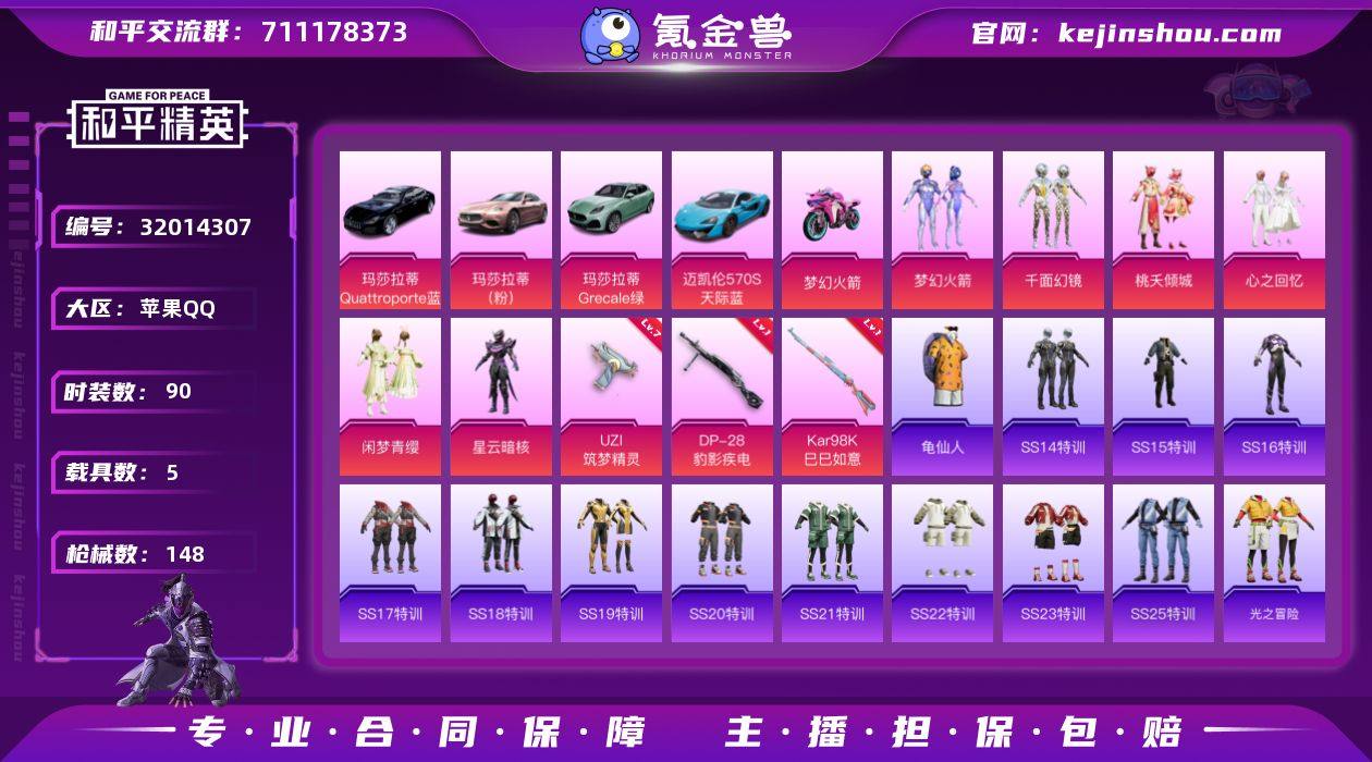 苹果精品载具号 6套粉装火箭少女千面幻境 3把特效满级UZI 5辆载具3辆玛莎 迈凯轮火箭少女摩托 喜欢手速手Q-6粉装-3特效枪-5载具-4粉色飞行器-48029热力值-14王牌印记-90套装-148枪皮 【热门品类】:粉装-梦幻火箭,套装-龟仙人 【粉色套装】:粉装-梦幻火箭,粉装-千面幻镜,粉装-桃夭倾城,粉装-心之回忆,粉装-闲梦青缨,角色-星云暗核 【粉色枪皮等级】:UZI-筑梦精灵(七级),Kar98K-巳巳如意(一级),DP-28-豹影疾电(一级) 【粉色载具】:玛莎拉蒂Quattroporte(夜幕蓝),玛莎拉蒂Ghibli(粉),玛莎拉蒂Grecale(薄荷绿),迈凯伦570S(天际蓝),双人摩托-梦幻火箭 【粉色枪皮】:UZI-筑梦精灵,Kar98K-巳巳如意,DP-28-豹影疾电 【粉色飞行器】:梦幻火箭飞行器,庄周梦蝶飞行器,千面幻镜飞行器,歌者泠鸢飞行器 【粉色降落伞】:甜心宝贝降落伞,梦幻火箭降落伞,蓝莓炮弹降落伞,流星咚咚降落伞,筑梦精灵降落伞,炙焰牛王降落伞,绒雪飘舞降落伞,垂柳戏鸭降落伞,彩虹甜喵降落伞,千面幻镜降落伞,桃夭倾城降落伞,海螺星光降落伞,第五大道降落伞 【稀有套装】:套装-龟仙人 【稀有枪皮】:AKM-彩虹符号,AKM-破晓战魂,AKM-筑梦精灵,AKM-胡桃卫兵,AKM-萌趣颜团子,AKM-虎虎生威,AKM-霓虹街区,M16A4-幻世战舞者,M16A4-甜心亚梦,M16A4-红色方程式,SCAR-L-炫彩节奏,SCAR-L-玉兔迎春,SCAR-L-粉锦千层,SCAR-L-红色方程式,M416-蓝色火焰,GROZA-异彩先驱,GROZA-彩虹符号,GROZA-恐龙拽拽,GROZA-懵萌河马,GROZA-田园牧歌,GROZA-紫翼圣骑,AUG-天降萌叽,AUG-耀粉歌者,AUG-金蛇镇世,QBZ-彩虹符号,QBZ-飞驰魅影,M762-天降萌叽,M762-彩虹符号,M762-瑞龙福将,Mk47-妙红点点,G36C-懵萌河马,AC-VAL-天降萌叽,AC-VAL-甜心亚梦,蜜獾-千面幻镜,蜜獾-天降萌叽,蜜獾-娇憨猪猪,蜜獾-桃夭...