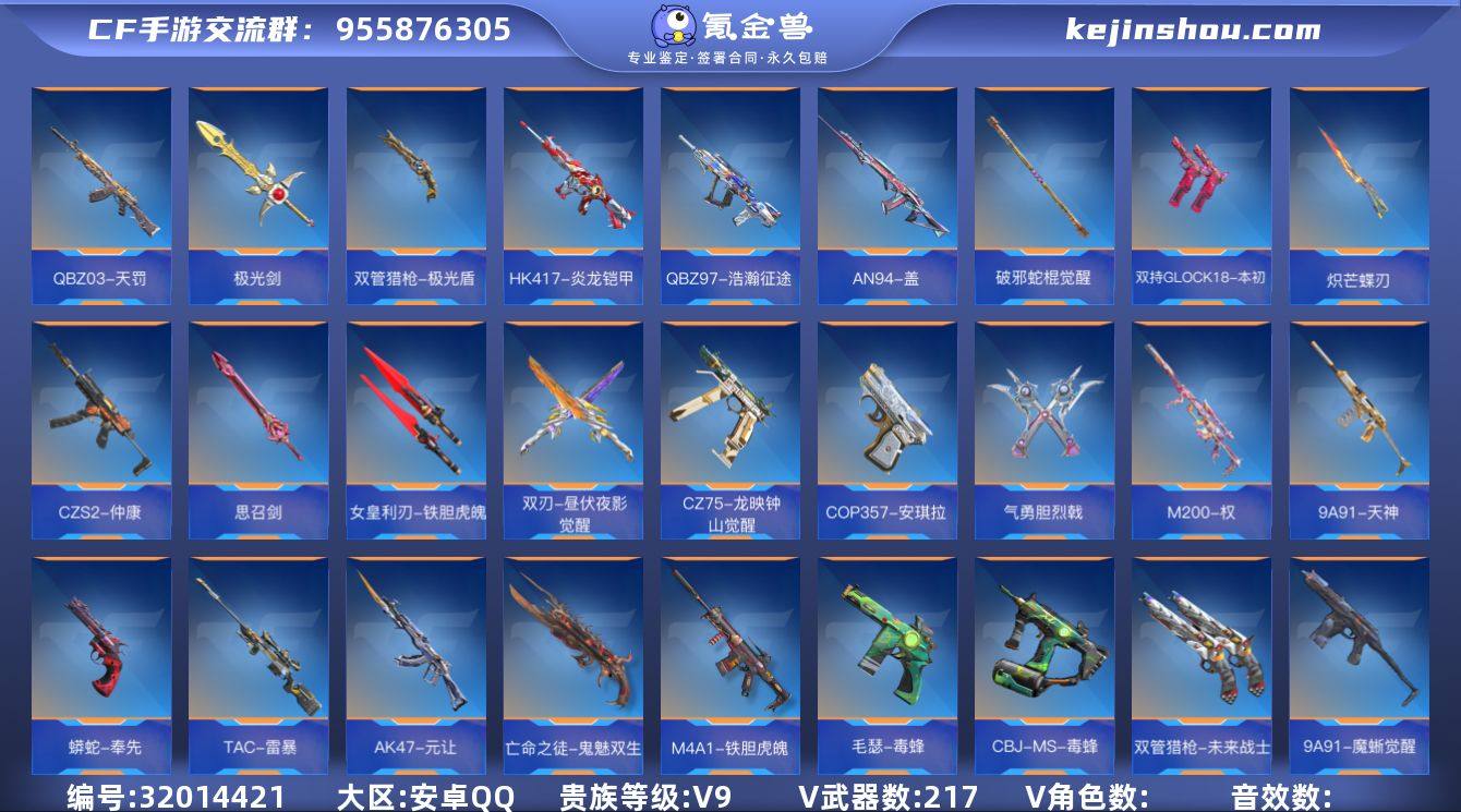 B652973 【极品v9满配爆破生化号-雷霆大炮-多款女团皮王者-带皮奉先星象套-本初宙斯擎天柱】 王者V武器数量40 英雄武器数量217 万化数量433 VIP等级【文本】VIP9级 【大师S】 【支持】 【是】 【可排位】 三国系列22 音效卡10 狙击枪线1 消灭音效7 语音卡9 最终消灭2 抛物线3 C4皮肤1 三国系列:AK47-奉先,AK47-孟德,AK47-元让,M4A1-星象,M4A1-仲达,M4A1-卧龙,M200-权,AWM-妙才,TAC-慈,MK47-仁德,KSG-孟获,CZS2-仲康,SCAR-文远,蟒蛇-奉先,双管猎枪-文远,双持GLOCK18-本初,COP357-星象,尼泊尔-星象,气勇胆烈戟,思召剑,虎贲钩镰刀,方天画戟; 音效卡:王者之力-现代战场,王者之怒-现代战场,王者之心-现代战场,王者之翼-现代战场,王者之光-现代战场,王者之武-现代战场,王者之神-现代战场,M200-幻神-现代战场,AK47-无影-电音,巴雷特-毁灭-现代战场; 狙击枪线:狙击枪线-HeartShot; 消灭音效:消灭音效-赏金猎人,消灭音效-8bit,消灭音效-能量核心,消灭音效-焰火贺岁,消灭音效-葫芦娃,消灭音效-斩杀,消灭音效-炎龙铠甲; 语音卡:岚兮儿语音卡,晴雅语音卡,雾萌萌语音卡,雨墨语音卡,蛇精语音卡,爷爷语音卡,葫芦娃语音卡,云悠悠语音卡,美女策划语音卡; 最终消灭:最终消灭-冰霜,最终消灭-太白诗仙; 抛物线:抛物线-能量核心,抛物线-HeartShot,抛物线-粉; C4皮肤:C4-星象;