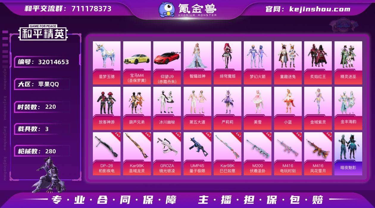 苹果 手Q-16粉装-5特效枪-3载具-5粉色飞行器-57810热力值-10王牌印记-118套装-137枪皮 【热门品类】:粉装-缤纷油彩,套装-浪漫天命,套装-胖达圆圆,套装-星河浪客,套装-潮萌小黄鸭,套装-暗影哥特,套装-浪漫波比,套装-粉红小猪 【粉色载具】:兰博基尼Aventador SVJ(翡翠绿),兰博基尼Estoque(银翼灰),路特斯ELETRE(花绽灰),空客H135-蔚蓝之翼 【粉色套装】:粉装-蝶舞迷情,粉装-缤纷油彩,粉装-新星烈龙,粉装-炙焰红王,角色-洛天依,粉装-沙场疾风,粉装-吟月归客,粉装-黄伞悠悠,粉装-黑伞漫漫,粉装-蓝莓炮弹,粉装-幻情紫藤,粉装-精灵娃娃,粉装-酣梦娃娃,粉装-天之羽翼,粉装-薄荷物语,粉装-炙焰牛王 【粉色枪皮等级】:SCAR-L-青春物语(四级),M416-风花雪月(七级),GROZA-焦糖拿铁(四级),M762-甜心娃娃(四级),平底锅-林间仙鹿(二级) 【粉色枪皮】:SCAR-L-青春物语,M416-风花雪月,GROZA-焦糖拿铁,M762-甜心娃娃,平底锅-林间仙鹿 【粉色飞行器】:春暖花开飞行器,梦幻火箭飞行器,齐天大圣飞行器,风花雪月飞行器,天之羽翼飞行器 【粉色降落伞】:春暖花开降落伞,梦幻火箭降落伞,神秘黑猫降落伞,洛神天依降落伞,风花雪月降落伞,红伞翩翩降落伞,蓝莓炮弹降落伞,绚金瑰梦降落伞,甜心娃娃降落伞,暗星紫秘降落伞,天之羽翼降落伞,焦糖拿铁降落伞,碧影闪光降落伞,恐龙拽拽降落伞,橘柚倾心降落伞 【稀有套装】:角色-多纳泰罗 【稀有枪皮】:AKM-夜灯,AKM-彩虹符号,AKM-春暖花开,AKM-破晓战魂,AKM-萌趣颜团子,AKM-虎虎生威,AKM-霓虹街区,AKM-龙的传人,M16A4-幻世战舞者,M16A4-甜心亚梦,M16A4-红色方程式,SCAR-L-炫彩节奏,SCAR-L-玉兔迎春,SCAR-L-碧影闪光,SCAR-L-红色方程式,SCAR-L-龙宫之主,M416-紫翼圣骑,M416-蓝色火焰,GROZA-异彩先驱,GROZA-春暖...