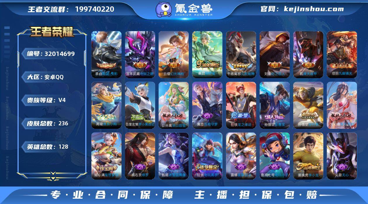 安卓Q-V4-最强王者段位-128英雄-236皮肤-1典藏皮肤-6传说-63史诗 【英雄全皮】:孙权全皮,敖隐全皮 【荣耀典藏】:李白鸣剑曳影 【传说皮肤】:云缨幻光神枪,桑启鸣野蒿,铠绛天战甲,刘备时之恋人,干将莫邪久胜战神,宫本武藏地狱之眼 【限定皮肤】:姜子牙天穹之誓,狄仁杰阴阳师,赵云皇家上将,孙尚香蔷薇恋人,庄周高山流水,高渐离玩趣恶龙,钟无艳超时空战士,扁鹊奇幻香踪,元歌无心,甄姬落雪兰心,狄仁杰魔术师,狄仁杰万华元夜,达摩沙漠行僧,项羽海滩派对,老夫子醍醐杖,程咬金演武夺筹,王昭君午后时光,兰陵王金庭之子,孙悟空至尊宝,孙悟空孙行者,李元芳云中旅人,钟馗驱傩正仪,杨玉环遇见飞天,杨戬潮玩骑兵,鬼谷子原初探秘者,鬼谷子五谷丰年,苏烈千军破阵,百里玄策原初追逐者,弈星混沌棋,沈梦溪大漠名商,明世隐疑决卦,裴擒虎李小龙,裴擒虎擒涛扼浪,狂铁电玩高手,云中君纤云弄巧,上官婉儿梁祝,嫦娥拒霜思,嫦娥暖冬兔眠,鲁班大师探海日志,桑启海盐诗旅,暃星界游侠,阿古朵江河有灵,张良古海寻踪,蒙犽百解令,蒙恬荣光圣徽,鬼谷子天穹祈灯,姬小满妄想食味,沈梦溪龙舞盛年,刘邦剑破天穹,程咬金群星魔术团,周瑜熔金海岸 【赛季限定】:弈星混沌棋,明世隐疑决卦,老夫子醍醐杖,鬼谷子原初探秘者,狄仁杰万华元夜,程咬金演武夺筹,钟馗驱傩正仪,苏烈千军破阵,达摩沙漠行僧,兰陵王金庭之子,沈梦溪大漠名商,李元芳云中旅人,桑启海盐诗旅,裴擒虎擒涛扼浪,鲁班大师探海日志,张良古海寻踪,鬼谷子天穹祈灯,刘邦剑破天穹,姜子牙天穹之誓,东皇太一噬灭天穹,太乙真人谧流熔炉,钟馗虚灵犬护,甄姬逆浪荇歌,亚瑟荣光之誓,百里玄策原初追逐者,蒙恬荣光圣徽,项羽九幽镇关 【战令限定】:狂铁电玩高手,王昭君午后时光,钟无艳超时空战士,甄姬落雪兰心,暃星...