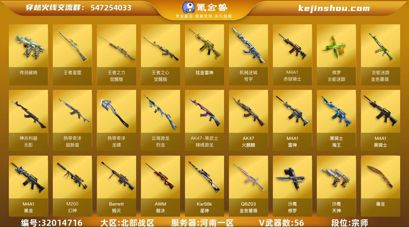 河南一区-58V-7王者武器数-1炫金武器数 【传说武器】:传说破晓 【传说角色】:传说影煞 【热门武器】:传说破晓,QBZ03-金色蔷薇,M200-幻神,金色蔷薇-古蛇迷踪,修罗-古蛇迷踪,M200-竞技荣光,死亡之眼*2,Kar98K-星神,M4A1-黑骑士,毁灭-孙三炮,裁决-雪莉杨,USP-雷暴,沙鹰-修罗,炽芒蝶刃 【王者炫金武器】:王者星霆,炫金雷神 【音效卡】:M4A1-黑骑士音效卡,Barrett-毁灭音效卡 【皮肤】:幻神-冠军之幻,雷神-暗月,毁灭-暗月,毁灭-百城浙江 皮肤,M4A1-千变-孔明皮肤,黑龙-能量核心,黑龙-暗月,黑骑士-暗月,无影-暗月*2,天启-暗月,战神-紫绶金章皮肤,战神-流金岁月皮肤,天龙-秘银,天龙-能量核心*2,修罗-能量核心,天神-暗月*3,屠龙-星火燎原,屠龙-春桃 皮肤 【角色】:电竞教官-云悠悠,王者-零,蛇隐宗,奇洋探员,乔伊教练,云海玲珑,炽天使,暗夜-X,电竞少女,芳心审判者,飞虎队-X,嘉年华灵狐,娟娟,兰-新年限定,0号玩家,灵狐者-X,灵狐者-职业经理,龙儿,龙儿-小淘气,玫瑰花神,潘多拉-X,蛇姬,斯沃特-X,蜀雪,铁骑荣耀,影武者-X,游珑儿 【人偶武器】:毁灭-孙三炮,裁决-雪莉杨,AWM-灵狐-15周年嘉年华,迷你深渊冰龙,迷你波特博士,夺魂,迷你生化手雷,深渊终结者手雷,沙鹰-夜玫瑰 【暴走生化】:死亡之眼*2,超级对讲机 【挑战大师】:冰龙粉碎者-白马银枪,激光毁灭者III-白马银枪*2,试炼破坏者III 【英雄级武器】:AK47-火麒麟,M4A1-黑龙,M4A1-雷神,M4A1-黑骑士,无影-神兵利器,黑武士-锦绣游龙,超新星-热带奇洋,金色蔷薇-古蛇迷踪,QBZ03-金色蔷薇,王者之心-觉醒版,黑骑士-海王,HK417-朱雀-电竞之星,机械迷城-穹宇,Barrett-毁灭,AWM-裁决,M200-幻神,Kar98K-星神,M200-竞技荣光,王者之力-觉醒版,烈龙-云海游龙,沙鹰-修罗,沙鹰-天神,USP...