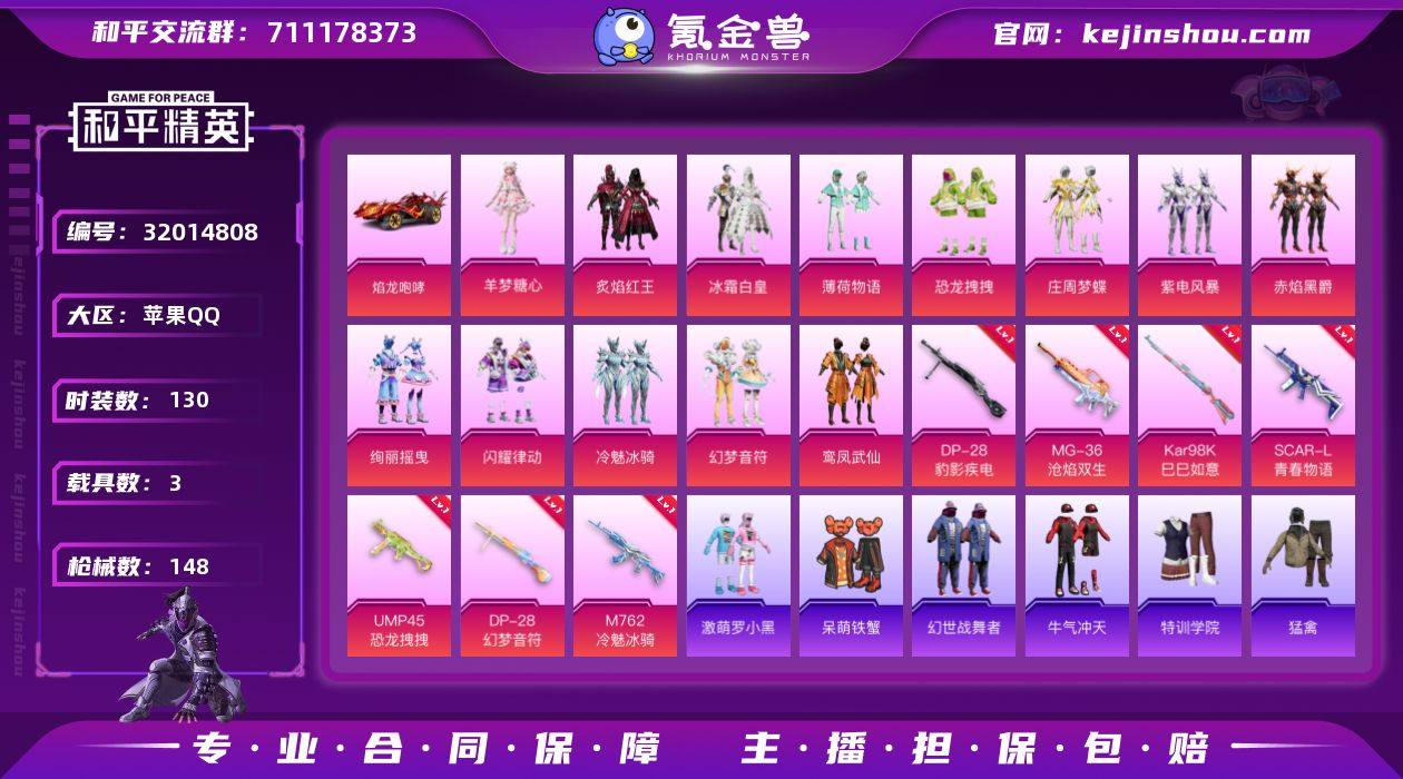 【13粉装7特效枪3载具 秒换绑不用等】 苹果Q区-58266热力值-4印记-130套装-148枪皮 【3载具】 路特斯EL蓝色 路特斯EV黄色 焰龙咆哮【13粉装】 冰霜白皇 庄周梦蝶 恐龙拽拽 闪耀律动 幻梦音符 绚丽摇曳 炙焰红王 紫电风暴 赤焰黑爵 冷魅冰骑 薄荷物语 鸾凤武仙 角色-羊梦糖心【7特效枪】 UMP45-恐龙拽拽(5级) SCAR-L-青春物语(7级) DP-28-幻梦音符(5级) M762-冷魅冰骑(6级) Kar98K-巳巳如意(5级) DP-28-豹影疾电(5级) MG-36-沧焰双生(5级)【48热门】 浪漫天命 破蛋小黄鸡 激萌罗小黑 暗影哥特(红眼罩) 豚鼠丹丹 GROZA-林间仙鹿 白色伏地魔 SS27特训 SS26特训 SS25特训 SS24特训 SS23特训 SS22特训 M762-橘柚倾心 M24-百合蜜语 2P战斗服款 AKM-缤纷海域 SCAR-L-玉兔迎春 GROZA-恐龙拽拽 M762-天降萌叽 Mk47-乌木金纹 UZI-娇憨猪猪 M249-彩虹符号 MG3-幻世战舞者 M416-紫翼圣骑 呆萌铁蟹 M416-蓝色火焰 长空猛禽 弄潮海豚 特训学院 青年教官 牛气冲天 霓虹街区 魅力单车 猎鹰 蓝色运动 橘黑制服 黄色运动 黄色伏地魔 红色运动 黑色伏地魔 风暴特警 粉红小猪 M762-奇异狩猎者 M416-糯团青竹 AWM-恐龙拽拽 Mini14-炫彩节奏 MG3-乌木金纹【10飞行器】 拂晓神骑飞行器 幻梦音符飞行器 冷魅冰骑飞行器 闪光银龙飞行器 庄周梦蝶飞行器 UMP45-涂山之恋 龙翔九天飞行器 炫彩糖果飞行器 飞天猪飞行器 繁龙极客飞行器【1背包】 萌熊伴侣背包 营地ID:783662030