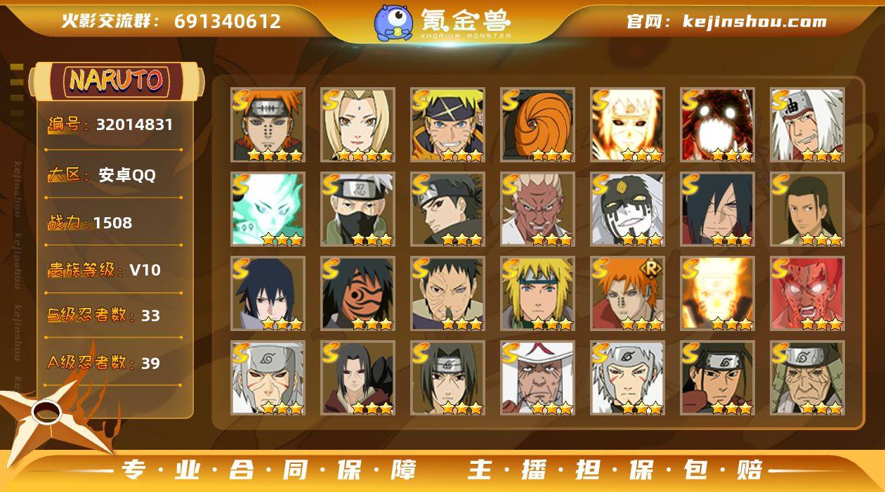 【火影忍者】战斗力:1508W+;段位:上忍1阶;本服排名:49;VIP:V10级;S忍:33个;A忍:39个;通灵兽:20个,S忍:秽土转生解宇智波斑|白面具宇智波斑|忍界大战宇智波带土|须佐能乎旗木卡卡西|秽土转生千手扉间|超佩恩天道|九喇嘛连结波风水门|五影会谈宇智波斑|天道佩恩 * 4星|传说中的三忍自来也|漩涡鸣人宇智波佐助|须佐能乎宇智波止水|秽土转生宇智波鼬|永恒万花筒宇智波佐助|最终章大筒木舍人|木叶创立千手柱间|忍界大战艾|舞之豪杰自来也|大蛇丸(普通)|纲手(普通) * 4星|波风水门|千手扉间(普通)|千手柱间(普通)|须佐能乎宇智波鼬|红夜之刃神秘面具男|秽土转生长门|死门迈特凯|忍界大战春野樱|九喇嘛连结漩涡鸣人|大筒木桃式|猿飞日斩(普通)|秽土转生猿飞日斩|暴怒第六尾漩涡鸣人__A忍:青春爆炸迈特凯|漂泊浪客宇智波带土|仙人模式巳月|幻之真容旗木卡卡西|忍界大战李洛克|漂泊浪客佩恩六道|秽土转生角都|忍界大战日向宁次|四代目土影黑土|青年长门|宇智波止水(普通)|青年波风水门|青年艾|近松十人卫千代|须佐能乎宇智波佐助|忍界大战秋道丁次|疾风传咒印宇智波佐助|万花筒写轮眼宇智波佐助|死司凭血飞段|疾风传我爱罗 * 3星|迪达拉(普通)|飞段(普通) * 3星|小南(普通)|神驹佑将小南|迈特凯(普通) * 5星|宇智波鼬(普通)|干柿鬼鲛(普通) * 5星|秽土转生桃地再不斩|蝎(普通) * 4星|绯流琥蝎|猿飞阿斯玛(普通) * 5星|桃式显现漩涡博人|六代目水影长十郎|不动|宇智波泉奈|羁绊神农|忍界大战土台|初始形态机械鸣人|侠隐江湖大野木__通灵兽:忍犬(普通)|蓝蛇|蛤蟆吉|砂之守鹤|忍龟|镰鼬|猿魔|山椒鱼|蜃|蛤蟆仙人|鲛鲨|蛤蟆健|熊猫|蛞蝓(普通)|乌鸦(普通)|蛤蟆龙|辛牙|蛤蟆广|梦貘|鹰