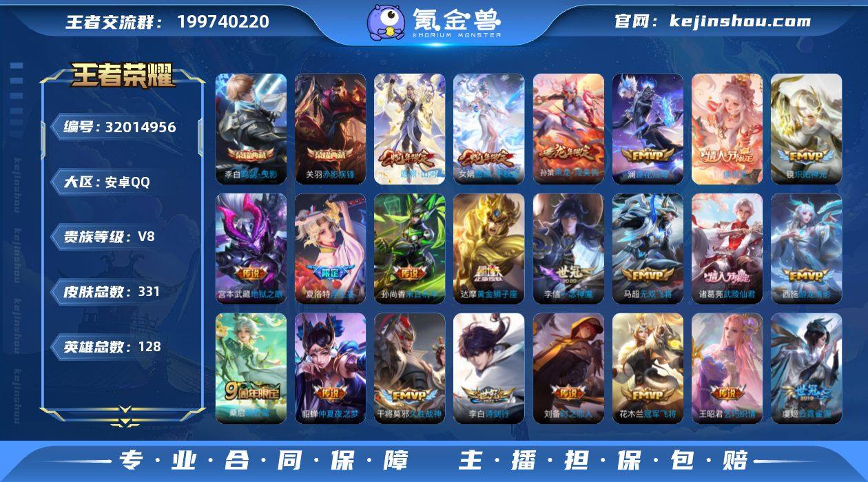 【特价出售】安卓Q-V8-至尊星耀IV段位-128英雄-331皮肤-2典藏皮肤-25传说-92史诗 【英雄全皮】:蒙恬全皮,司空震全皮,戈娅全皮,空空儿全皮,影全皮 【荣耀典藏】:李白鸣剑曳影,关羽赤影疾锋 【传说皮肤】:西施续相思,司空震愿照山河定,女娲愿照千秋盛,桑启鸣野蒿,孙策乘龙淬吴钩,澜逐花归海,夏洛特浮生妄,李白诗剑行,马超无双飞将,王昭君乞巧织情,西施游龙清影,镜炽阳神光,虞姬启明星使,李信一念神魔,刘备时之恋人,张良黄金白羊座,干将莫邪久胜战神,虞姬云霓雀翎,达摩黄金狮子座,花木兰冠军飞将,诸葛亮武陵仙君,貂蝉仲夏夜之梦,孙尚香末日机甲,宫本武藏地狱之眼,孙悟空地狱火 【限定皮肤】:蒙犽顽岩魄,蔡文姬夏日便利店,大乔绒语心约,虞姬夏日便利店,姜子牙天穹之誓,李白谪仙醉月,狄仁杰阴阳师,赵云皇家上将,孙尚香蔷薇恋人,阿轲迷踪丽影,钟无艳王者之锤,吕布猎兽之王,吕布御风骁将,周瑜赤莲之焰,夏侯惇朔风刀,曹操天狼征服者,典韦岱宗,马可波罗逐梦之星,马可波罗暗影游猎,狄仁杰魔术师,狄仁杰万华元夜,达摩沙漠行僧,项羽海滩派对,老夫子醍醐杖,程咬金演武夺筹,刘邦夺宝奇兵,韩信飞衡,韩信傲雪梅枪,兰陵王驯魔猎人,兰陵王金庭之子,孙悟空至尊宝,李元芳云中旅人,虞姬霸王别姬,虞姬启明星使,钟馗驱傩正仪,杨玉环遇见飞天,鬼谷子原初探秘者,诸葛亮武陵仙君,苏烈千军破阵,百里玄策原初追逐者,弈星混沌棋,沈梦溪大漠名商,明世隐疑决卦,裴擒虎李小龙,裴擒虎擒涛扼浪,米莱狄胡桃异想国,云中君纤云弄巧,猪八戒西部大镖客,上官婉儿神器万象笔,嫦娥拒霜思,嫦娥暖冬兔眠,西施玲珑珍味,鲁班大师探海日志,桑启海盐诗旅,夏洛特浮生妄,暃星界游侠,戈娅驭风魔法,艾琳流音漫舞,司空震地狱燃心,阿古朵江河有灵,张良古海寻踪,蒙犽百解...