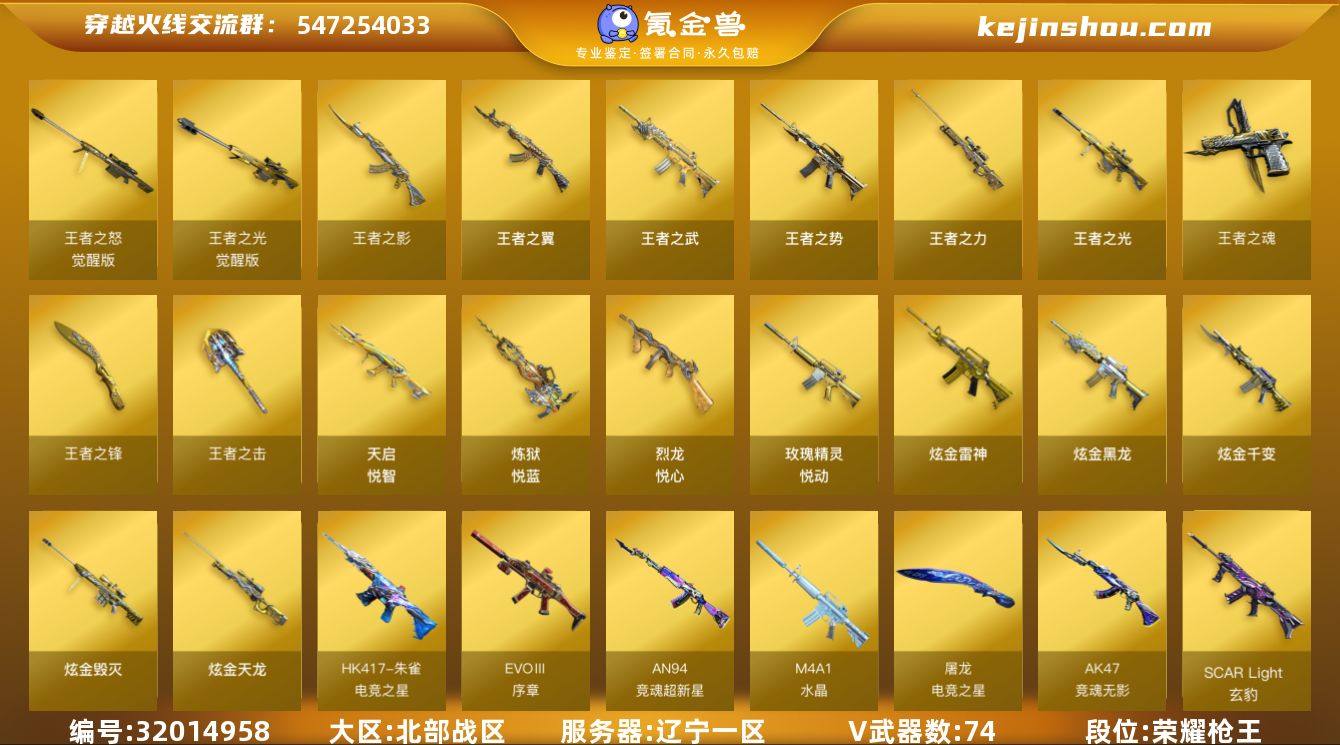 实名:不可二次实名 段位:荣耀枪王 VIP等级:VIP3 V武器数:74 王者武器数:20 CF点:1203 AK47-竞魂无影,AN94-竞魂超新星,EVOⅢ-序章,HK417-朱雀-电竞之星,M4A1-水晶,屠龙-电竞之星,回声刃-荣耀之巅,SCAR Light-玄豹,机械迷城-穹宇,雷霆之锋,Glock18-武圣,AK47-火麒麟,AK47-无影,AK47-黑武士,AK47-机械迷城,M4A1-雷神,M4A1-黑骑士,M4A1-死神,M4A1-黑龙,M4A1-武圣,M4A1-千变,M4A1-猎神,M4A1-玫瑰精灵,Barrett-毁灭,Barrett-极光,蔷薇大炮,AWM-天龙,AK12-天启,AN94-超新星,QBZ03-金色蔷薇,屠龙,龙啸,麒麟刺,擎天,M200-竞技荣光,擎天-竞技荣光,裁决,天神 王者之怒-觉醒版,王者之光-觉醒版,王者之影,王者之翼,王者之武,王者之势,王者之力,王者之光,王者之魂,王者之锋,王者之击,天启-悦智,炼狱-悦蓝,烈龙-悦心,玫瑰精灵-悦动 HK417-朱雀-电竞之星-竞星跃动音效卡,屠龙-电竞之星-竞星跃动音效卡 炫金雷神,炫金黑龙,炫金千变,炫金毁灭,炫金天龙 异变清道夫-蛇影双骄,冰火魔兽,海滩汪汪-巴雷特,裁决-雪莉杨,M4A1-刀锋,火麒麟-灵狐,M37-葵,COP-旗袍 卖家说:7位数QQ,装备爆破生化全装。排位荣耀