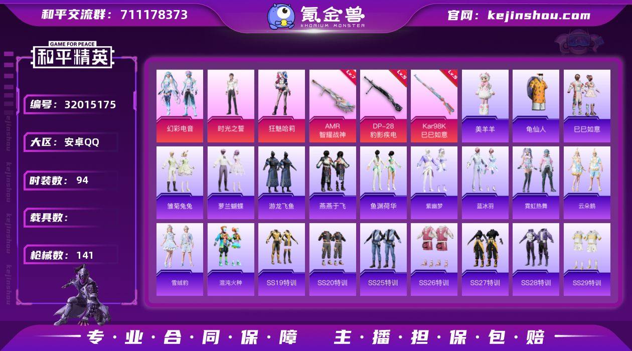 无二次安卓 手Q-3粉装-4特效枪-0载具-1粉色飞行器-37059热力值-6王牌印记-94套装-141枪皮HZ2632011 【热门品类】:套装-龟仙人 【粉色套装】:粉装-幻彩电音,角色-时光之誓,角色-狂魅哈莉 【粉色枪皮等级】:Kar98K-巳巳如意(五级),Mk14-福马献瑞(一级),AMR-智耀战神(七级),DP-28-豹影疾电(五级) 【粉色枪皮】:Kar98K-巳巳如意,Mk14-福马献瑞,AMR-智耀战神,DP-28-豹影疾电 【粉色飞行器】:时光之誓飞行器 【粉色降落伞】:幻影战神降落伞,智耀战神降落伞,时光之吻降落伞,双重狂想降落伞 【稀有套装】:套装-龟仙人,套装-巳巳如意,套装-雏菊兔兔,套装-萝兰蝴蝶,套装-游龙飞鱼,套装-燕燕于飞,套装-鱼渊荷华,套装-紫幽梦,套装-蓝冰羽,套装-霓虹热舞,套装-云朵鹅,套装-雪绒豹,套装-混沌火种,玩偶服-美羊羊 【稀有枪皮】:AKM-奇异狩猎者,AKM-彩虹符号,AKM-破晓战魂,SCAR-L-夜灯,SCAR-L-红色方程式,SCAR-L-冷漠罗丽,M416-糯团青竹,M416-蓝色火焰,AUG-耀粉歌者,M762-彩虹符号,M762-云朵鹅,AC-VAL-快闪甜心,AC-VAL-时光之吻,AC-VAL-六号稻草人,蜜獾-天降萌叽,UZI-啾咪啾咪,UMP45-生命誓言,UMP45-蓝色火焰,Vector-焰鹰斗篷,Vector-生命誓言,汤姆逊-天降萌叽,汤姆逊-奇异狩猎者,汤姆逊-耀粉歌者,汤姆逊-智耀战神,P90-快闪甜心,P90-巳巳如意,Kar98K-彩虹符号,M24-幻彩电音,M24-时光之吻,AWM-焰鹰斗篷,SKS-炫彩节奏,SKS-圣域龙灵,MK20-H-快闪甜心,SVD-云朵鹅,S686-繁龙极客,S686-奇异狩猎者,S686-生命誓言,S686-巳巳如意,S12K-玩趣呆呆,S12K-破晓战魂,S12K-幻世战舞者,S12K-智耀战神,DBS-焰鹰斗篷,DBS-彩虹符号,DBS-幻彩电音,SPAS-12-云朵鹅,M249-彩虹符号,M249-破晓战魂,M249-莲影清波,DP-28-焰鹰斗篷,MG3-镜域双华,MG3-幻世战舞者,蝎式手枪...