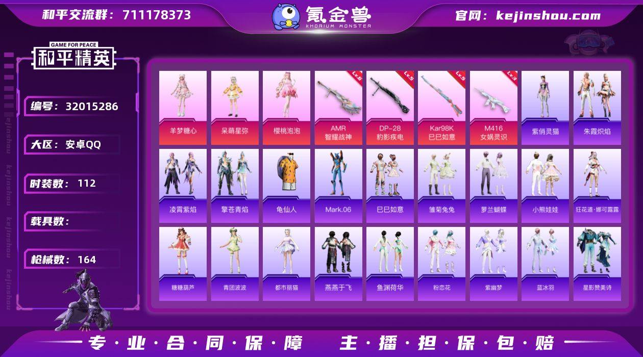 不可二次 安卓 手Q-3粉装-4特效枪-0载具-0粉色飞行器-47975热力值-13王牌印记-112套装-164枪皮 QW263404 【热门品类】:套装-龟仙人,角色-Mark.06 【粉色套装】:角色-呆萌星弥,角色-樱桃泡泡,角色-羊梦糖心 【粉色枪皮等级】:M416-女娲灵识(三级),Kar98K-巳巳如意(五级),AMR-智耀战神(六级),DP-28-豹影疾电(五级) 【粉色枪皮】:M416-女娲灵识,Kar98K-巳巳如意,AMR-智耀战神,DP-28-豹影疾电 【粉色降落伞】:星夜魔法师降落伞,第五大道降落伞,圣堂之誓降落伞,初号机 觉醒Ver.降落伞,拳皇·狂花道降落伞,绯穹魔姬降落伞 【稀有套装】:套装-龟仙人,套装-巳巳如意,套装-雏菊兔兔,套装-萝兰蝴蝶,套装-小熊娃娃,角色-狂花道·娜可露露,套装-糖糖葫芦,套装-青团波波,角色-都市丽猫,套装-燕燕于飞,套装-鱼渊荷华,套装-粉恋花,套装-紫幽梦,套装-蓝冰羽,套装-星影赞美诗,套装-彩虹兔,套装-云朵鹅,套装-雪绒豹,角色-乐音,角色-玫纹锢梦,角色-绛羽幽主,套装-朱霞炽焰,套装-凌霄紫焰,套装-擎苍青焰,角色-紫俏灵猫 【稀有枪皮】:AKM-彩虹符号,AKM-春暖花开,AKM-灼热熔岩,AKM-生命誓言,AKM-破晓战魂,AKM-虎虎生威,AKM-霓虹街区,AKM-龙的传人,M16A4-幻世战舞者,M16A4-千金淑猫,SCAR-L-玉兔迎春,SCAR-L-红色方程式,M416-夜灯,M416-糯团青竹,M416-红色方程式,M416-蓝色火焰,GROZA-异彩先驱,AUG-天降萌叽,AUG-耀粉歌者,QBZ-相思残雪,M762-天降萌叽,M762-云朵鹅,G36C-星穹咏叹调,AC-VAL-天降萌叽,蜜獾-天降萌叽,蜜獾-娇憨猪猪,蜜獾-虎痴许褚,蜜獾-绯穹魔姬,ARX-凌霄紫焰,UZI-天降萌叽,UZI-娇憨猪猪,UZI-红色方程式,UMP45-蓝色火焰,Vector-彩虹符号,Vector-生命誓言,汤姆逊-异彩先驱,汤姆逊-炫彩节奏,汤姆逊-耀粉歌者,汤姆逊-樱桃泡泡,MP5K-异彩先驱...