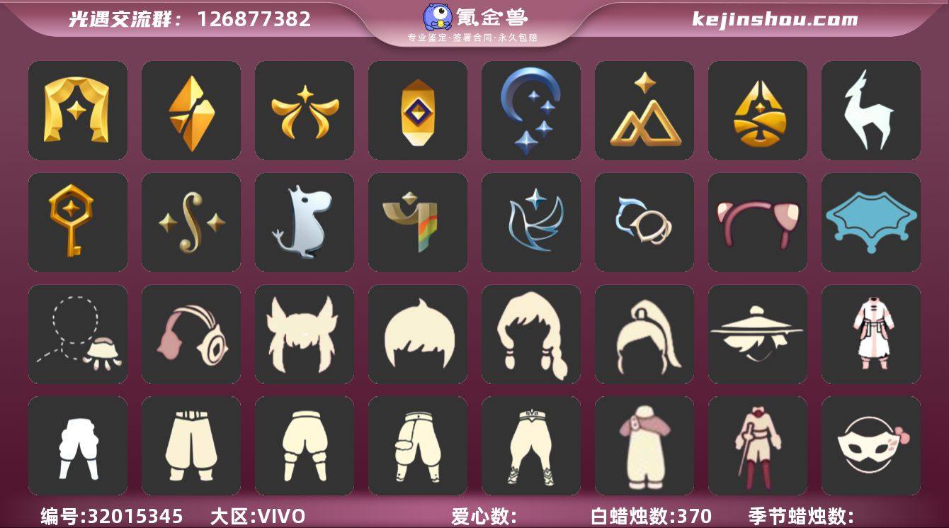 编号A60-368 安卓手机 换绑CD2.17 详情请看衣柜截图 蜡烛数:297 爱心数:161 季节已毕业:潜海季 表演季 破晓季 欧若拉季 追忆季 九色鹿季 筑巢季 二重奏季 姆明季 彩染季 珍稀物品:白枭 透明蝶翼斗 完成地图:全图毕业 礼包:巫师 绊爱 小狗周年发饰 兔子 四叶草 新年耳钉 彩虹耳钉 围巾 创始人 奥利奥狗抱枕 裤子:背带裤 双子裤 遥鲲裙 白色背心套装 蓝绿裤 乞丐裤 飞天裤 采药人裤 古风裤 小灰裙 姆明季·裤子 妮妮裙子 彩染挑衅艺伎裤子 彩染跳跃舞者裤子 五周年裤子 遥鲲沙滩短裤 万圣裤 蛇年裤子 毛靴裤 搓澡巾 灯笼裤 紧身裤 连体裤 武士裤 雪人裤 加减裤 王子服 渔夫裤子套装 杂技裤 猫猫裤 小丑裤 绿长裤 猎手长袍 筑巢季·裤子 鞋子:长筒凉鞋 毛靴 布鞋 鱼嘴凉靴 姆明季·鞋子 彩染挑衅艺伎鞋子 彩染跳跃舞者鞋子 万圣鞋 芭蕾鞋 寻宝长靴 面具:矮人面具 黄鼠狼 呼吸面具 黄眉企鹅面具 黑脸白眉面具 忧郁脸面具 白环面具 红色条纹面具 蓝色条纹面具 白色条纹面具 绿色条纹面具 贴花面具 九色鹿面具 玫瑰面具 黑脸 面饰:蒙眼面巾 蔚蓝眼镜 青鸟毕业面饰 肯德基联动眼镜 发型:魔法帽 公主 粗辫 书虫 总裁发型 正太 高马尾 脏辫发型 明制 若笠 花环 斜刘海发型 卷发 虚荣 军帽 白枭 冥龙长辫 遥鲲长辫 皇冠水母头 吊环双辫发型 老兵凌乱发型 史力奇发型 古典长发 猎手长发 樱花 马蹄莲发型 猫耳 女巫 头饰:草帽 小鸟头饰 羽毛装饰 黄色蝴蝶结 花环 珊瑚 贝雷帽 太阳帽 小黄帽 红耳机 斗篷:白斗 菱形斗篷 白金 红金 黑金 白鸟斗 蝴蝶斗篷 黄色蓑衣 三色斗篷 燕尾斗篷 双色方块斗篷 半边围巾斗篷 水母斗篷 遥鲲短斗篷 遥鲲长斗 透明蝶翼斗 小熊猫分体斗篷 姆明季·斗篷 樱花斗 郁金香斗 马蹄莲斗绿芽 海洋斗 鱼纹斗 彩虹斗 蓝浴巾 粉浴巾 万圣斗 圣诞斗 黄浴巾 配饰:手持小铃铛 大铃铛乐器...