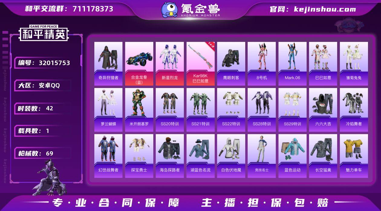 安卓 手Q-1粉装-1特效枪-1载具-0粉色飞行器-18970热力值-1王牌印记-42套装-69枪皮 QW263405 【热门品类】:套装-奇异狩猎者,角色-8号机,角色-Mark.06 【粉色套装】:粉装-新星烈龙 【粉色枪皮等级】:Kar98K-巳巳如意(三级) 【粉色载具】:合金龙骨(蓝) 【粉色枪皮】:Kar98K-巳巳如意 【粉色降落伞】:青春物语降落伞,炙焰牛王降落伞,环太平洋降落伞,精灵梦叶罗丽降落伞,创世·救赎降落伞,忍者神龟降落伞 【稀有套装】:套装-巳巳如意,套装-雏菊兔兔,套装-萝兰蝴蝶,角色-米开朗基罗 【稀有枪皮】:AKM-影袭,M16A4-幻世战舞者,M16A4-甜心亚梦,SCAR-L-红色方程式,M416-月影鸳鸯,M416-蓝色火焰,GROZA-彩虹符号,GROZA-影袭,AUG-耀粉歌者,QBZ-彩虹符号,M762-绒雪飘舞,AC-VAL-甜心亚梦,蜜獾-娇憨猪猪,UZI-娇憨猪猪,UZI-影袭,汤姆逊-环太平洋,P90-闪光银龙,Kar98K-影袭,M24-影袭,M24-歌者泠鸢,M24-奇异狩猎者,AWM-炙焰牛王,SLR-娇憨猪猪,S686-生命誓言,S1897-炫彩节奏,S12K-垂柳戏鸭,S12K-娇憨猪猪,S12K-幻世战舞者,S12K-暖熊萌萌,DBS-甜心亚梦,DP-28-甜心亚梦,DP-28-齐天大圣,短管霰弹-竹节火铳 【其他套装】:套装-SS20特训,套装-SS21特训,套装-SS22特训,套装-SS28特训,套装-SS29特训,套装-六六大吉,套装-冷焰舞者,套装-幻世战舞者,套装-探宝勇士,套装-海岛探路者,套装-湖蓝色名流,套装-白色伏地魔,套装-竞技名士,套装-蓝色运动,套装-长空猛禽,套装-魅力单车,套装-黄色名流,套装-黑色伏地魔,套装-沙漠毒蛇,套装-鹰眼刺客,套装-冰冻风暴,套装-漫步者,套装-奇异狩猎者,套装-冰川特警,套装-甜心亚梦,套装-虚音幻奏,套装-娇憨猪猪,套装-萌趣咩咩,角色-白光莹,套装-纯真浪花,套装-热情海星,角色-极地流光,角色-8号机,角色-Mark.06 【稀有头盔...