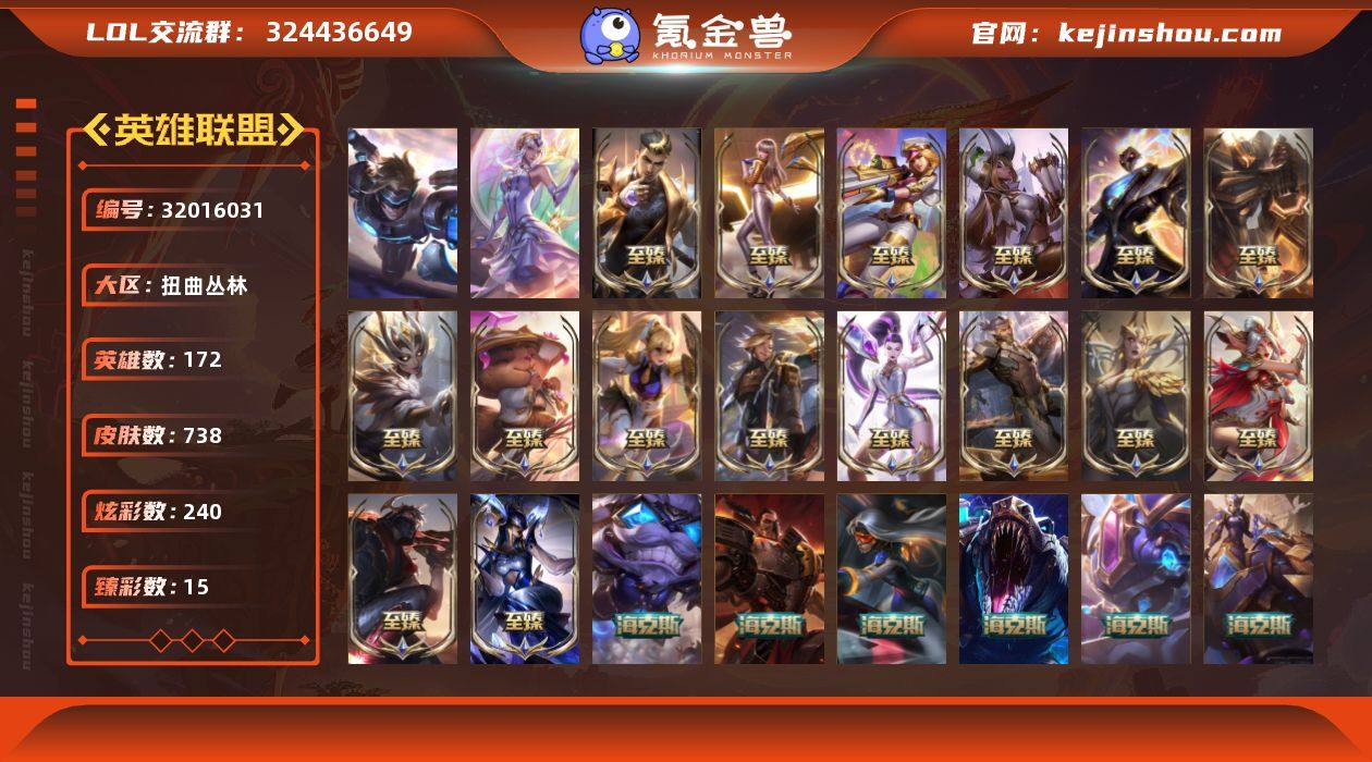t37167 皇冠账号【扭曲丛林】738皮肤 240炫彩 15臻彩 30神话/117限定/75传说/172英雄 账号等级:677 【重要头像】爱情之歌 觅心游侠卢锡安 我麦是开的么 救生圈 KDA萨勒芬妮 星守金克丝炫彩 披萨鸡 至臻青花瓷丽桑卓 至臻战斗学院蕾欧娜 至臻灵魂莲华提莫 至臻魔女婕拉 【重要皮肤】机神玄武盖伦至臻 T1杰斯至臻 青花瓷丽桑卓至臻 西部魔影猎天使恶魔泰隆至臻 神凰行者烈羽焰凰霞至臻 战斗学院蕾欧娜至臻 魔女婕拉至臻 魔女乐芙兰至臻 灵魂莲华提莫至臻 灵能特工伊泽瑞尔至臻 源计划逆流塞拉斯至臻 KDA二代卡莎至臻 KDA一代卡莎至臻 电玩女神凯特琳至臻 电玩女神凯特琳2022至臻 魅惑女巫厄运小姐至臻 未来战士锤石至臻 未来战士锤石2022至臻 灰烬骑士派克 海克斯科技瑟庄妮 海克斯科技雷克顿 海克斯科技克格莫 海克斯科技吉格斯 黎明使者卡尔玛 恐惧新星德莱厄斯 新创战纪希维尔 胜利行刑官德莱文 创星之灵璐璐 荣誉使者玛尔扎哈 电玩女神厄运小姐 电玩勇者锐雯 电玩女神阿狸 星之守护者伊泽瑞尔 玉剑传说无影 女帝格温 玉剑传说神机花火 玉剑传说舞龙卫 灵能特工易 银龙裁决泰隆 天龙之子斯莫德 虎头虎脑崔丝塔娜 替父从军花木兰 碧玉之牙卡西奥佩娅 春晖神女拉克丝 你看见过我的熊猫吗安妮 北辰之威内瑟斯 广寒仙子嫦娥 虎痴之拳蔚 司马懿仲达 金猪烈焰瑟庄妮 烈焰美人薇恩 福牛守护者嘉文四世 胜利枪神卢锡安 胜利之剑亚托克斯 甜心宝贝安妮 觅心游侠卢锡安 觅心魔灵奥莉安娜 觅心萝莉金克丝 觅心猫猫悠米 觅心猎手薇恩 北极星使者萨科 圣诞老人德莱文 魄罗骑士瑟庄妮 圣诞糖果棒厄运小姐 魅惑女巫迦娜 魅惑女巫厄运小姐 克烈古拉伯爵 泳池派对凯特琳 泳池派对辛德拉 泳池派对塔里克 制胜金球拉莫斯 DRX凯特琳 FPX锤石 F...