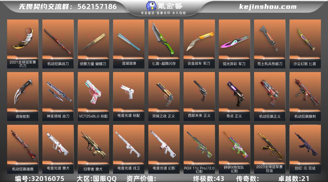 23枪 性价比成品号 超凡 【套装】:电音光谱套装,《英雄联盟:双城之战》套装,机动狂飙套装,神中神罚套装,紫阙金琅套装 【英雄】:幻棱,炼狱,维斯,暮蝶,钛狐,壹决,铁臂,捷风,雷兹,幽影,不死鸟,贤者,猎枭,蝰蛇,零,芮娜,奇乐,尚勃勒,霓虹,斯凯,夜露,星礈,K/O,海神,盖可,黑梦,钢锁 【近战武器】:近战武器-2021全球冠军赛 爪刀,近战武器-谐波音谱,近战武器-神之刃,近战武器-侦察力量 蝴蝶刀,近战武器-剥皮小刀,近战武器-紫金爪刀,近战武器-黑波之刃,近战武器-镭切,近战武器-澄湖潋滟,近战武器-超限闪存 匕首,近战武器-合金战车 军刀,近战武器-弧光异彩 军刀,近战武器-荒土机兵 热能刀,近战武器-机动狂飙 战刀,近战武器-金琅斧,近战武器-全息匕首,近战武器-沙尘幻旅 匕首,近战武器-诡秘蛇影 军刀,近战武器-神圣领域 战刀 【狂徒】:狂徒-2023全球冠军赛,狂徒-归零者,狂徒-混沌序曲,狂徒-机动狂飙,狂徒-创·纪元,狂徒-RGX 11z Pro,狂徒-掠影,狂徒-盖亚的复仇,狂徒-海洋之星,狂徒-黑市,狂徒-起源,狂徒-紫阙金琅,狂徒-离子武器//2.0,狂徒-弧光异彩,狂徒-荒土机兵,狂徒-沙尘幻旅,狂徒-诡秘蛇影 【幻影】:幻影-砰砰X特攻队,幻影-RGX 11z Pro//2.0,幻影-电音光谱,幻影-侦察力量,幻影-紫阙金琅//2.0,幻影-海洋之星//2.0,幻影-神中神罚,幻影-超限闪存,幻影-合金战车,幻影-噬源兽防卫工程,幻影-神圣领域,幻影-纳米打击,幻影-战术小伙伴,幻影-末日之翼,幻影-电音光谱 【戍卫】:戍卫-电音光谱,戍卫-紫阙金琅,戍卫-彩梦之城,戍卫-浮光跃金,戍卫-花漾粉红,戍卫-萌彩剪影,戍卫-逆冲蛮牛,戍卫-月球哨兵,戍卫-折光棱晶,戍卫-电音光谱 【獠犬】:獠犬-归零者,獠犬-电音光谱,獠犬-弧光异彩,獠犬-神圣领域,獠犬-胡桃狂想,獠犬-模拟赫兹,...