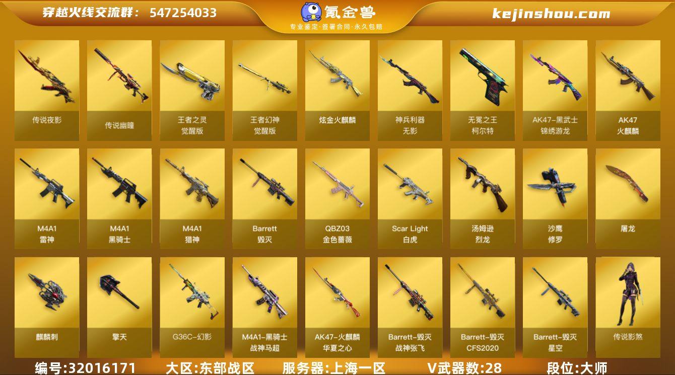 上海一区-32V-4王者武器数-1炫金武器数 【传说武器】:传说夜影,传说幽瞳 【传说角色】:传说星骇,传说影煞 【热门武器】:传说夜影,传说幽瞳,G36C-幻影,QBZ03-金色蔷薇,Scar Light-白虎,M4A1-黑骑士,汤姆逊-烈龙,沙鹰-修罗 【王者炫金武器】:王者冰锋,炫金火麒麟 【音效卡】:M4A1-雷神音效卡,M4A1-黑骑士音效卡 【皮肤】:星神-璀璨皮肤,火麒麟-华夏之心,毁灭-星空,毁灭-CFS2020,毁灭-战神张飞,黑骑士-战神马超,黑骑士-破界 皮肤 【角色】:王者玲珑,蛇隐宗,乔伊教练,云海玲珑,初恋灵狐,电竞少女,0号玩家,龙儿,潘多拉-甜心教官,蛇姬,斯沃特-X,游珑儿 【人偶武器】:迷你深渊冰龙,迷你生化手雷 【英雄级武器】:AK47-火麒麟,M4A1-雷神,M4A1-黑骑士,Scar Light-白虎,无影-神兵利器,G36C-幻影,黑武士-锦绣游龙,QBZ03-金色蔷薇,M4A1-猎神*2,Barrett-毁灭,王者幻神-觉醒版,汤姆逊-烈龙,沙鹰-修罗,柯尔特-无冕之王,王者之灵-觉醒版,屠龙,擎天,麒麟刺,王者冰锋-觉醒版,高爆手雷-雷霆,高爆手雷-云龙,闪光弹-雷霆,闪光弹-云龙,烟雾弹-雷霆,烟雾弹-云龙,烟雾弹-古蛇迷踪 【道具】:CFS限定背包,超级背包,黄金生化钩,绿色巨人,灵魂忍者,迷雾幽灵,夺命之镰,防化服*2,金色流光-枪王排位*2,星辰流光-枪王排位,枪王排位28赛季金色流光,枪王排位29赛季金色流光,EP战队名片,EP战队喷图,EP战队击杀图标,防弹头盔*3,防弹衣*3,C4工具钳*3,手雷包*3 【特殊枪械】:1白虎,1黑骑士,1烈龙