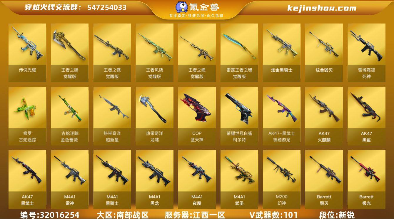 江西一区-105V-8王者武器数-2炫金武器数 【传说武器】:传说光耀 【热门武器】:传说光耀,G36C-幻影,QBZ03-金色蔷薇,Scar Light-白虎,M200-幻神,柯尔特-荣耀世冠白鲨2023,金色蔷薇-古蛇迷踪,修罗-古蛇迷踪,M200-竞技荣光,死亡之眼*2,Kar98K-星神,毒蜂,M4A1-黑骑士*2,汤姆逊-烈龙*6,RPK-盘龙*5,加特林-炼狱*3,斯泰尔-蝴蝶,雷神-小红,毁灭-孙三炮,USP-雷暴,COP-堕天神,沙鹰-修罗*2,炽芒蝶刃,荣耀世冠-龙啸 【王者炫金武器】:炫金骑士,炫金毁灭 【音效卡】:AK47-火麒麟音效卡,M4A1-黑骑士音效卡,死神-雪域霜狐-怀旧音效卡 【皮肤】:幻神-星耀 皮肤,幻神-Heartshot 皮肤,金色蔷薇-Heartshot皮肤,金色蔷薇-破浪逐光 皮肤,裁决-流光秘银,裁决-巅峰荣耀 皮肤,Kar98K-星神-AG-CFPLS21冠军皮肤,雷神-荣耀之魄,雷神-耀金皮肤,雷神-R.LGD-CFPLS18冠军,火麒麟-华夏之心,火麒麟-战神关羽,火麒麟-巅峰荣耀,毁灭-暗月,毁灭-SV-CFPLS16冠军,黑龙-能量核心,黑龙-冠军之武,极光-能量核心,屠龙-荣耀之锋,屠龙-星火燎原,屠龙-星耀 皮肤 【角色】:樱,电竞教官-云悠悠,王者零-华冠丽服,王者沙漠玫瑰,雪域霜狐,蛇隐宗,奇洋探员,暗夜-X,北极狐-X,芳心审判者,飞虎队-X,兰-海滩派对,潘多拉-X,潜龙队-X,蛇姬,蜀雪,影武者-X,游珑儿 【人偶武器】:雷神-小红,毁灭-孙三炮,天龙-曼陀罗,火麒麟-灵狐,斯泰尔-蝴蝶,Scar Light-马枪,AWM-灵狐-15周年嘉年华,迷你深渊冰龙,迷你牛牛,迷你生化手雷*3,生化手雷-机甲核心*2,灵狐娃娃手雷 【暴走生化】:毒蜂,死亡之眼*2 【挑战大师】:神圣爆裂者III,VEPR-12-金魔,激光毁灭者III 【英雄级武器】:AK47-火麒麟*2,M4A1-黑龙*2,M4A1-雷神*2,M4A1-黑骑士*2,AK47-黑武士,AK12-天启,M4A1-武圣,AK47-黑鲨,Scar Light-...