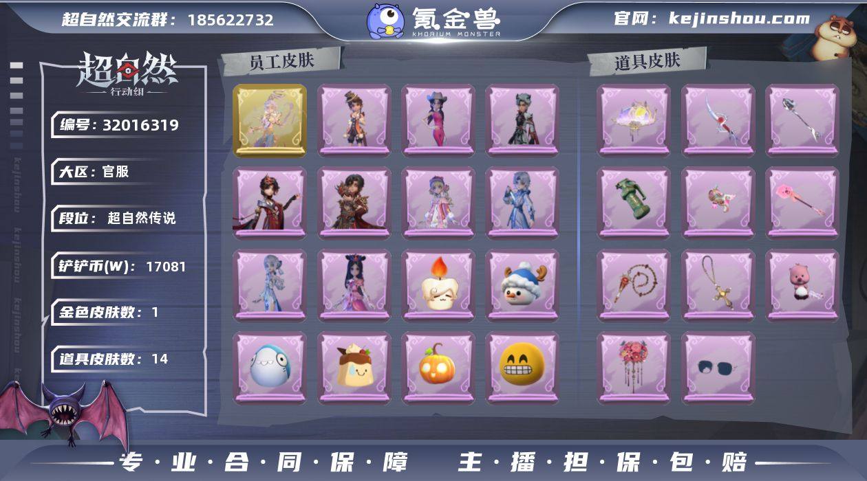 金皮1;紫皮9;道具皮14;皮肤:逍遥-莲华渡,零-青云逸歌,阿念-庆宴绮愿,小黄-罗丽,艾伦-黎明猎手,薇薇安-仙锋小姐,巫铃儿-素影瑶光,爱丽丝-耀眼的你,零-搬开山,爱丽丝-甜梦派对;道具:闪光弹-金戈玄铜,摸金符-祝祷词,铲子-赞萌波板糖,刺刀-铂刺与红萼,折扇-赴此良宵,喷气背包-乘风溯雪,额外的背包-飞花令,黄牛能量饮料-无人岸,铲子-撒拉弗的祷告,长鞭-缚誓之锁,短管猎枪-赞萌露比水枪,急救包-蔷薇物语,夜视仪-金丝眼镜,电击枪-甜蜜泡泡枪;饰品:头饰-萨卡班甲鱼头套,头饰-鱼头怪头套,头饰-面具马头套,头饰-蒜了八,头饰-惊魂南瓜头套,头饰-烛光纪念,头饰-马上有钱,头饰-嘻嘻头套,头饰-哈士奇头套,头饰-呆滞头套,头饰-太空鲨头套,头饰-卑微头套,头饰-樱桃奶油布丁,头饰-雪墩墩头套,头饰-饺饺者头套,头饰-烈焰红唇头套,头饰-滑稽头套,头饰-像素朋克墨镜,头饰-后室幸存者头套,挂饰-不朽的今夜,挂饰-糖果守卫,挂饰-小鲨包包,挂饰-尘封旧事,挂饰-九色祥鹿,背饰-白鼬趴趴,背饰-侧耳倾听,背饰-天使的呼唤,背饰-牛啤背包,背饰-蝶恋花;动作:动作-心跳摇,动作-伤心摇,动作-新年摇,动作-知世摇,动作-青海摇,动作-金城舞,动作-舞台中心,动作-抬手,动作-拜年,动作-蝴蝶步,动作-要糖,动作-举牌;工牌背景:工牌背景-珊瑚海,工牌背景-复活的肖像,工牌背景-花蕾城堡,工牌背景-佛系小豚,工牌背景-甜心的囚笼,工牌背景-圣光之誓;工牌动作:工牌动作-轻躯鹤立,工牌动作-春色盈怀,工牌动作-虔诚之姿;员工:逍遥,兰,薇薇安,零,巫铃儿,小黄,爱丽丝,爱德华,阿念,艾伦,莉莉,临云;累充766元;铲铲币1708.1万;金砖22;段位:超自然传说273;魔盒等级:2