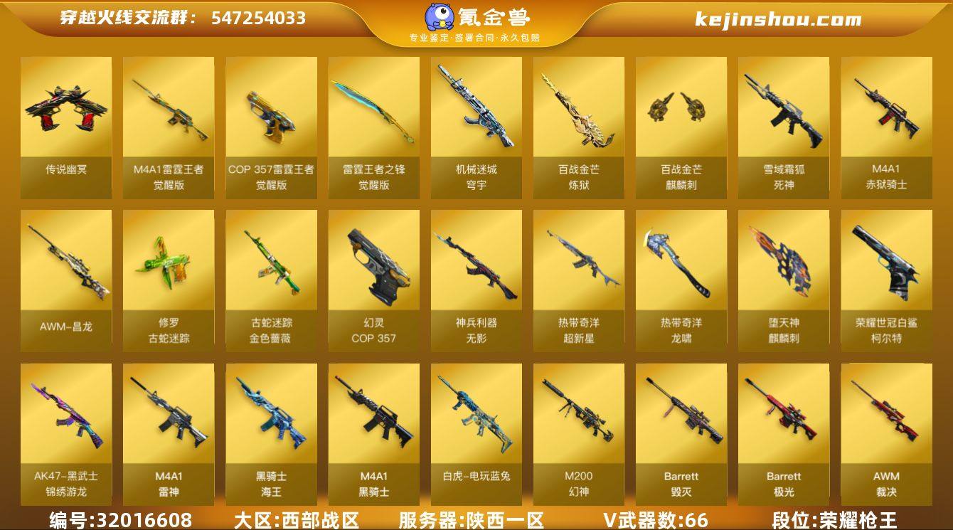 陕西一区-76V-12王者武器数-0炫金武器数 【传说武器】:传说幽冥 【热门武器】:传说幽冥,QBZ03-金色蔷薇,M200-幻神*2,柯尔特-荣耀世冠白鲨2023,金色蔷薇-古蛇迷踪,修罗-古蛇迷踪,死亡之眼,白虎-电玩蓝兔,柯尔特-冠军之特,Kar98K-星神,金色小号,Cat-刀锋,牛牛-AK47,M4A1-黑骑士,加特林-炼狱*2,USP-钞能力灵狐,COP 357-幻灵,沙鹰-修罗*3,炽芒蝶刃,炽芒蝶刃-荣耀世冠白鲨2023 皮肤 【音效卡】:M200-幻神音效卡,M4A1-黑骑士音效卡,Barrett-毁灭音效卡,QBZ03-金色蔷薇音效卡,Kar98K-星神音效卡,Barrett-碧霄极光音效卡,炼狱-百战金芒-庆典舞曲音效卡,死神-雪域霜狐-怀旧音效卡,柯尔特-百战金芒-庆典舞曲音效卡 【皮肤】:M200-幻神-黄忠皮肤,幻神-Heartshot 皮肤,幻神-曹操 皮肤,金色蔷薇-热带奇洋 皮肤,裁决-流光秘银,裁决-羽掣 皮肤,雷神-荣耀之魄,雷神-星空,雷神-源计划2.0专属 皮肤,雷神-化蛇 皮肤,M4A1-再燃火线,火麒麟-平天大圣,毁灭-荣耀之怒,毁灭-星空,M4A1-千变-孔明皮肤,修罗-星空,屠龙-荣耀之锋*2,屠龙-春桃 皮肤,轻型军用手斧-再燃火线,炽芒蝶刃-荣耀世冠白鲨2023 皮肤 【角色】:葵,雾萌萌,晴雅,隼,星际战将,零·纪元,战地猎狐,王者影豹,雪域霜狐,蛇隐宗,奇洋探员,葵-阿尔法武装,暗夜-X,芳心审判者,飞虎队-X,风暴女,嘉年华灵狐,荆棘玫瑰,娟娟,葵-赛博朋克,兰-梨园特工,兰-新年限定,猎狐者-追月,0号玩家,灵狐-花神,麻雀,玫瑰花神,潘多拉-X,蛇姬,蜀雪,兔囡囡,铁扇公主-暗灵,维纳斯,雪莉杨-摸金校尉,夜玫瑰-宠粉,影武者-X,智影 【人偶武器】:M4A1-雷神-精英刀锋,Scar Light-马枪,街机小灰机,USP-钞能力灵狐,AWM-灵狐-15周年嘉年华*2,Cat-刀锋,牛牛-AK47,迷你裂空之翼,迷你牛魔王,迷你波特博士,迷你曼提柯尔...
