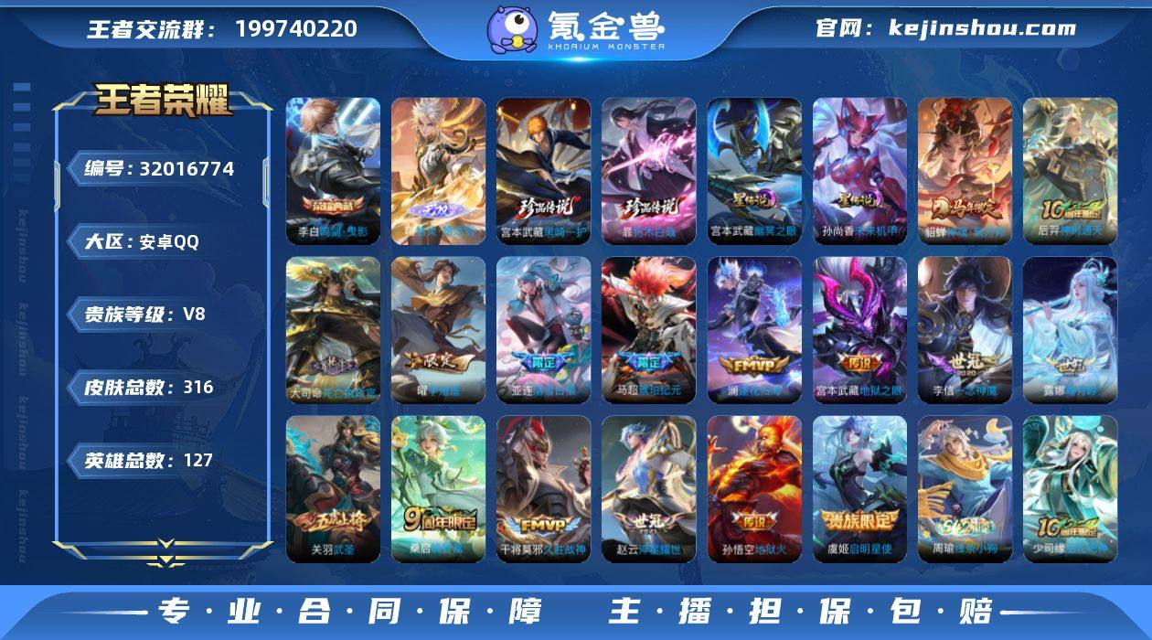 可换绑【店长推荐精品号·李白典藏·曜无双·宫本暃双珍品·马年貂蝉·马超琥珀纪元·李逍遥·关羽武圣·青龙志·朱雀志·多传说限定号】11按键,2星传说,21王者印记,满级铭文,可二次CD17875,安卓Q-V8-316皮肤-1典藏皮肤-1无双-2珍品传说-16传说-82史诗【英雄全皮】:空空儿全皮【荣耀典藏】:李白鸣剑曳影【无双皮肤】:曜器灵螭龙剑【珍品传说】:宫本武藏黑崎一护,暃朽木白哉【星元皮肤】:宫本武藏幽冥之眼,孙尚香未来机甲【传说皮肤】:貂蝉神骥聚万邦,后羿神树通天,大司命死亡执政官,桑启鸣野蒿,亚连落雪白狼,马超琥珀纪元,澜逐花归海,露娜霜月吟,赵云淬星耀世,曜李逍遥 ,虞姬启明星使,关羽武圣,李信一念神魔,干将莫邪久胜战神,宫本武藏地狱之眼,孙悟空地狱火【限定皮肤】:白起狰,姜子牙天穹之誓,狄仁杰阴阳师,虞姬凯尔特女王,赵云皇家上将,墨子神迹守卫,嬴政白昼王子,鲁班七号狮舞东方,庄周高山流水,高渐离死亡摇滚,高渐离玩趣恶龙,钟无艳王者之锤,孙膑妖精王,扁鹊炼金王,芈月重明,芈月幻夜卜梦,吕布猎兽之王,元歌云间偶戏,元歌无心,夏侯惇朔风刀,曹操烛龙,典韦穷奇,狄仁杰魔术师,狄仁杰万华元夜,达摩星际陆战队,达摩沙漠行僧,项羽海滩派对,老夫子醍醐杖,老夫子航海奇遇记,关羽冰锋战神,关羽武圣,程咬金演武夺筹,兰陵王金庭之子,花木兰默契交锋,亚瑟潮玩骑士王,孙悟空至尊宝,牛魔御旌,后羿圣弓游侠,李元芳云中旅人,虞姬启明星使,钟馗神迹守卫,钟馗驱傩正仪,杨玉环遇见飞天,干将莫邪冰霜恋舞曲,干将莫邪真爱魔法,雅典娜黎明之约,蔡文姬繁星吟游,太乙真人饕餮,太乙真人华丽摇滚,鬼谷子原初探秘者,鬼谷子五谷丰年,黄忠火炮绅士,铠青龙志,苏烈千军破阵,百里玄策原初追逐者,百里守约朱雀志,弈星混沌棋,梦奇顽趣,沈梦溪大漠名商,明世隐...