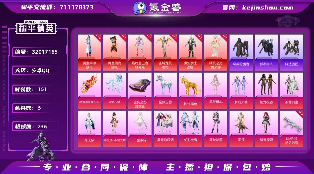 安卓 【精品质量红装号/8王牌印记/魔童闹海-敖丙(四级)/魔童闹海-哪吒/最终圣卫者-帕修斯/圣域龙灵-瑞拉/幽焰骑士-维塔/精灵之光-露米娜/粉装-梦幻火箭/粉装-冰霜白皇/角色-洛天依/粉装-繁龙极客/角色-狂花道·不知火舞/角色-千金淑猫/粉装-星穹咏叹调/粉装-幻彩电音/角色-狂魅哈莉/角色-罗征/角色-绯穹魔姬/角色-羊梦糖心/虚妄之影(炫耀紫)/踏焰逐风摩托车/僚机-圣域龙宝/僚机-冰龙团团/星梦玉骢/护世瑞兽/冰绡玉鳞/6神装-13粉装-19特效枪-5载具-18粉色飞行器-101044热力值】手Q-6神装-13粉装-19特效枪-5载具-18粉色飞行器-101044热力值-8王牌印记-151套装-236枪皮 【红色神装等级】:魔童闹海-敖丙(四级),魔童闹海-哪吒(一级),最终圣卫者-帕修斯(一级),圣域龙灵-瑞拉(一级),幽焰骑士-维塔(一级),精灵之光-露米娜(一级) 【红色角色神装】:魔童闹海-敖丙,魔童闹海-哪吒,最终圣卫者-帕修斯,圣域龙灵-瑞拉,幽焰骑士-维塔,精灵之光-露米娜 【热门品类】:粉装-梦幻火箭,粉装-繁龙极客,套装-都市猎人,套装-奇异狩猎者,套装-胖达团团,套装-星河浪客,套装-六号树人 【粉色套装】:粉装-梦幻火箭,粉装-冰霜白皇,角色-洛天依,粉装-繁龙极客,角色-狂花道·不知火舞,角色-千金淑猫,粉装-星穹咏叹调,粉装-幻彩电音,角色-狂魅哈莉,角色-罗征,角色-绯穹魔姬,角色-羊梦糖心 【粉色枪皮等级】:AKM-幽焰骑士(三级),SCAR-L-童趣迷兔(五级),SCAR-L-魔童闹海 哪吒(六级),M416-墨龙九天(三级),GROZA-精灵之光(三级),AUG-星梦奇缘(三级),UMP45-相思残雪(七级),Vector-最终圣卫者(三级),AKS-74U-星穹咏叹调(五级),P90-魔童闹海 敖丙(三级),Kar98K-巳巳如意(五级),Kar98K-圣域龙灵(三级),Mk14-甜梦熊击(五级),DP-28-豹影疾电(五级),MG3-洛神天依(六级),MG-36-幻彩电音(一级),MG-36-沧焰双生...
