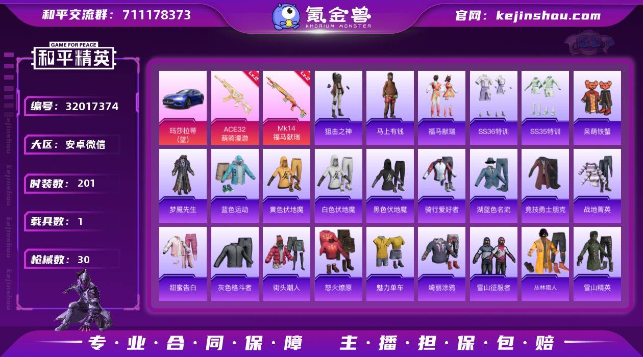 实名: 可修改 时装数: 201 载具数: 1 枪械数: 30 战备数: 1 热门装扮: 呆萌铁蟹,梦魇先生 载具: 玛莎拉蒂Ghibli(蓝) 稀有枪皮: MK14-福马献瑞,ACE32-萌骑漫游