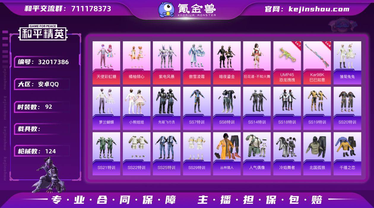 安卓 手Q-6粉装-3特效枪-0载具-1粉色飞行器-40020热力值-3王牌印记-92套装-124枪皮 【粉色套装】:粉装-天使彩虹糖,粉装-橘柚倾心,粉装-紫电风暴,粉装-傲雪凌霜,粉装-暗夜鎏金,角色-狂花道·不知火舞 【粉色枪皮等级】:UMP45-恐龙拽拽(七级),Kar98K-巳巳如意(四级),Mk14-福马献瑞(一级) 【粉色枪皮】:UMP45-恐龙拽拽,Kar98K-巳巳如意,Mk14-福马献瑞 【粉色飞行器】:百合蜜语飞行器 【粉色降落伞】:绿意幻情降落伞,焦糖拿铁降落伞,恐龙拽拽降落伞,幻梦音符降落伞,橘柚倾心降落伞,冷魅冰骑降落伞,筑梦精灵降落伞,圣光天使降落伞,垂柳戏鸭降落伞,暗夜鎏金降落伞,未来歌姬降落伞,炫光之旅降落伞,拳皇·狂花道降落伞 【稀有套装】:套装-马上来财,套装-雏菊兔兔,套装-萝兰蝴蝶,套装-小熊娃娃,套装-先驱飞行员,角色-曹焱兵 【稀有枪皮】:AKM-夜灯,AKM-彩虹符号,AKM-恐龙拽拽,AKM-灼热熔岩,AKM-环太平洋,AKM-破晓战魂,AKM-霓虹街区,M16A4-幻世战舞者,M16A4-甜心亚梦,SCAR-L-炫彩节奏,SCAR-L-玉兔迎春,SCAR-L-碧影闪光,SCAR-L-红色方程式,M416-滑板小狐,M416-红色方程式,M416-蓝色火焰,GROZA-异彩先驱,GROZA-恐龙拽拽,GROZA-治愈之星,GROZA-黑色刀锋,AUG-耀粉歌者,QBZ-彩虹符号,QBZ-未来歌姬,QBZ-飞驰魅影,M762-天降萌叽,M762-彩虹甜喵,G36C-冷魅冰骑,G36C-星穹咏叹调,AC-VAL-天降萌叽,AC-VAL-甜心亚梦,UZI-啾咪啾咪,UZI-生命誓言,UMP45-蓝色火焰,Vector-彩虹符号,Vector-治愈之星,Vector-生命誓言,Vector-香水柠檬,Vector-黑色刀锋,汤姆逊-异彩先驱,汤姆逊-环太平洋,汤姆逊-耀粉歌者,MP5K-异彩先驱,P90-飞驰魅影,P90-巳巳如意,Kar98K-彩虹符号,Kar98K-梦幻火箭,Kar98K-炫彩节奏,Kar98K-飞驰魅影,M24-治愈之星,M24-炫彩节奏,AWM-恐龙拽拽...