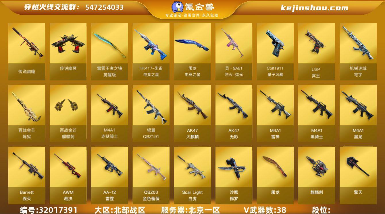 北部战区(北京一区)lb【高质量皮肤号】双传说【传说幽瞳,传说幽冥】38v【M200-竞技荣光,ScarLight-白虎+音效卡,QBZ191-银翼,QBZ03-金色蔷薇+双皮/破浪逐光/量子蔷薇,AWM-裁决+皮/运输船,USP-冥王,炽芒蝶刃+皮/破浪逐光,ScarLight-马枪,猫猫手套】2王者【王者凤吟,雷霆王者之锋】9角色【四防晴雅,四防研,零·纪元,幻面灵狐,葵-阿尔法武装,奇洋探员,乔伊教练,修道士,云海玲珑】10音效【ScarLight-白虎音效卡,M4A1-雷神音效卡,M4A1-黑骑士音效卡,炼狱-百战金芒-庆典舞曲音效卡,HK417-朱雀-电竞之星-竞星悦动音效卡,屠龙-电竞之星-竞星悦动音效卡,Barrett-碧霄极光音效卡】16皮【幻神-星火小队签名臻藏版,星神-巅峰荣耀,金色蔷薇-破浪逐光,金色蔷薇-量子蔷薇,屠龙-破浪逐光,炽芒蝶刃-破浪逐光,黑龙-冠军之武,雷神-宇航兔,裁决-运输船,擎天-冠军之击,黑骑士-冠军之势,火麒麟-传奇EVEN,雷神-神秘按键,毁灭-SV-CFPLS16冠军】【vip5】截图展示段位不代表实际段位 如赛季更新等不可抗拒因素发生变化、时限道具不保证所剩时间