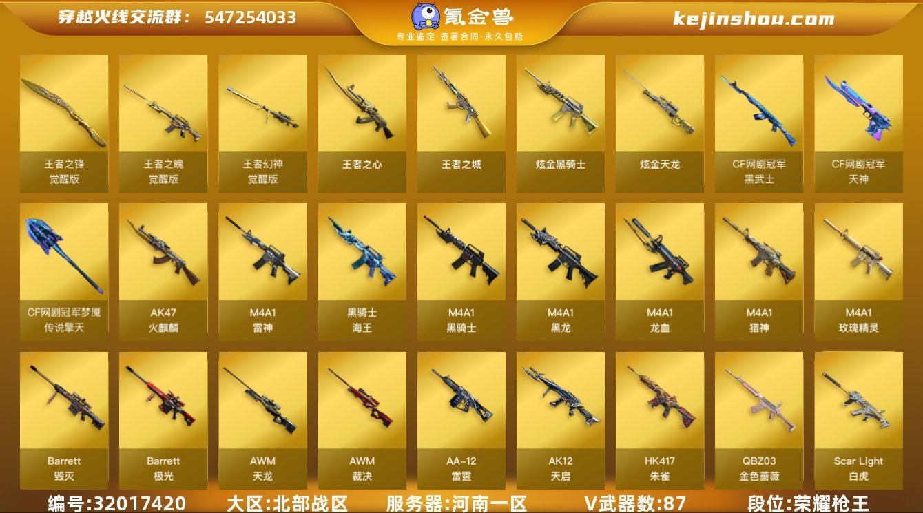 河南一区-91V-5王者武器数-2炫金武器数 【热门武器】:QBZ03-金色蔷薇,Scar Light-白虎,HK417-朱雀,死亡之眼,M4A1-黑骑士*5,汤姆逊-烈龙*8,加特林-炼狱*2,斯泰尔-蝴蝶,USP-雷暴,沙鹰-修罗*6 【王者炫金武器】:王者之城,王者之心,炫金骑士,炫金天龙 【音效卡】:AK47-火麒麟音效卡*2,M4A1-黑骑士音效卡,Barrett-毁灭音效卡*2,Barrett-极光音效卡 【皮肤】:AWM-裁决-百城联赛天津皮肤,雷神-暗月,雷神-星空,黑龙-暗月,战神-粉色甜心皮肤*2,战神-紫绶金章皮肤*2,战神-流金岁月皮肤,AK47-B-常胜将军-曹操,AK47-B-常胜将军-孙权 【角色】:迷迭香,空,北极狐-X,初恋灵狐,嘉年华灵狐,灵狐者-职业经理,邱刚敖,青霞仙子,兔囡囡,雪莉杨 【人偶武器】:斯泰尔-蝴蝶,AWM-灵狐-15周年嘉年华,迷你裂空之翼,迷你牛魔王,迷你牛牛 【暴走生化】:死亡之眼 【挑战大师】:暴君乱世-超越Max,冰龙粉碎者-白马银枪*3,激光毁灭者III-白马银枪,激光毁灭者III,KAC-圣炎切割者III 【英雄级武器】:AK47-火麒麟,M4A1-黑龙,M4A1-雷神*3,M4A1-黑骑士*5,AK12-天启*2,M4A1-龙血,HK417-朱雀,Scar Light-白虎,M4A1-玫瑰精灵,QBZ03-金色蔷薇,M4A1-猎神,9A91-烈火,王者之魄-觉醒版,黑骑士-海王,AK47-B-常胜将军,黑武士-CF网剧冠军,AWM-天龙,Barrett-毁灭*2,Barrett-极光,AWM-裁决*5,Barrett-金色蔷薇*3,王者幻神-觉醒版,加特林-炼狱*2,汤姆逊-烈龙*8,AA-12-雷霆*2,沙鹰-修罗*6,沙鹰-天神,USP-雷暴,天神-CF网剧冠军,屠龙*6,擎天,麒麟刺*3,斩神刀-雷暴,擎天-CF网剧冠军,王者之锋-觉醒版,高爆手雷-雷暴*4,高爆手雷-幻灵,闪光弹-雷暴*4,闪光弹-幻灵,烟雾弹-雷暴*4,烟雾弹-幻灵 【道具】:BS战队炫彩背包,冰冰企鹅背包-猛男专用,背包-葫芦兄弟,超级背包,女皇终结者...