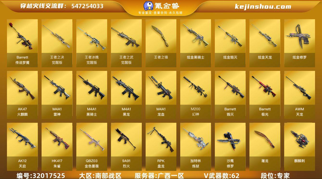 广西一区-66V-4王者武器数-7炫金武器数 【传说武器】:传说梦魇 【热门武器】:传说梦魇,QBZ03-金色蔷薇,HK417-朱雀,M200-幻神,M200-竞技荣光,荣耀世冠-火麒麟,M4A1-黑骑士,RPK-盘龙,加特林-炼狱,降世魔童,USP-雷暴,沙鹰-修罗*3 【王者炫金武器】:王者之锋,炫金骑士*3,炫金毁灭,炫金天龙*2,炫金修罗 【音效卡】:M200-幻神音效卡,AK47-火麒麟音效卡,M4A1-雷神音效卡,M4A1-黑骑士音效卡,Barrett-毁灭音效卡 【皮肤】:幻神-丹凤,雷神-暗月,雷神-耀金皮肤,雷神-传奇N9,雷神-宠儿-2019MVP,雷神-烈虎皮肤,火麒麟-轻羽皮肤,毁灭耀金皮肤,M4A1-黑龙-361,天龙-能量核心,AWM-天龙-传奇70KG,极光-能量核心 【角色】:电竞教官-云悠悠,王者-瞳-闭月羞花,王者葵-惊若翩鸿,乔伊教练,云海玲珑,青霞仙子,莎莎 【人偶武器】:火麒麟-灵狐*3,迷你深渊冰龙,降世魔童 【暴走生化】:超级对讲机 【挑战大师】:AK47-冰龙粉碎者 【英雄级武器】:AK47-火麒麟*2,M4A1-黑龙,M4A1-雷神,M4A1-黑骑士,AK12-天启,M4A1-龙血*3,HK417-朱雀,QBZ03-金色蔷薇,9A91-烈火,王者之武-觉醒版,王者冰魄-觉醒版,荣耀世冠-火麒麟,AWM-天龙*5,Barrett-毁灭*2,Barrett-极光,M200-幻神,M200-竞技荣光,王者之决-觉醒版,RPK-盘龙,加特林-炼狱,沙鹰-修罗*3,USP-雷暴,柯尔特-竞技荣光,屠龙*5,擎天,麒麟刺*2,擎天-竞技荣光,高爆手雷-竞技荣光*7,闪光弹-竞技荣光*7,烟雾弹-竞技荣光*8 【道具】:超级背包,生化弹匣,夺命之镰,防化服,防弹头盔*2,防弹衣*3,C4工具钳*2,手雷包*2 【特殊枪械】:1黑骑士,1盘龙,1炼狱