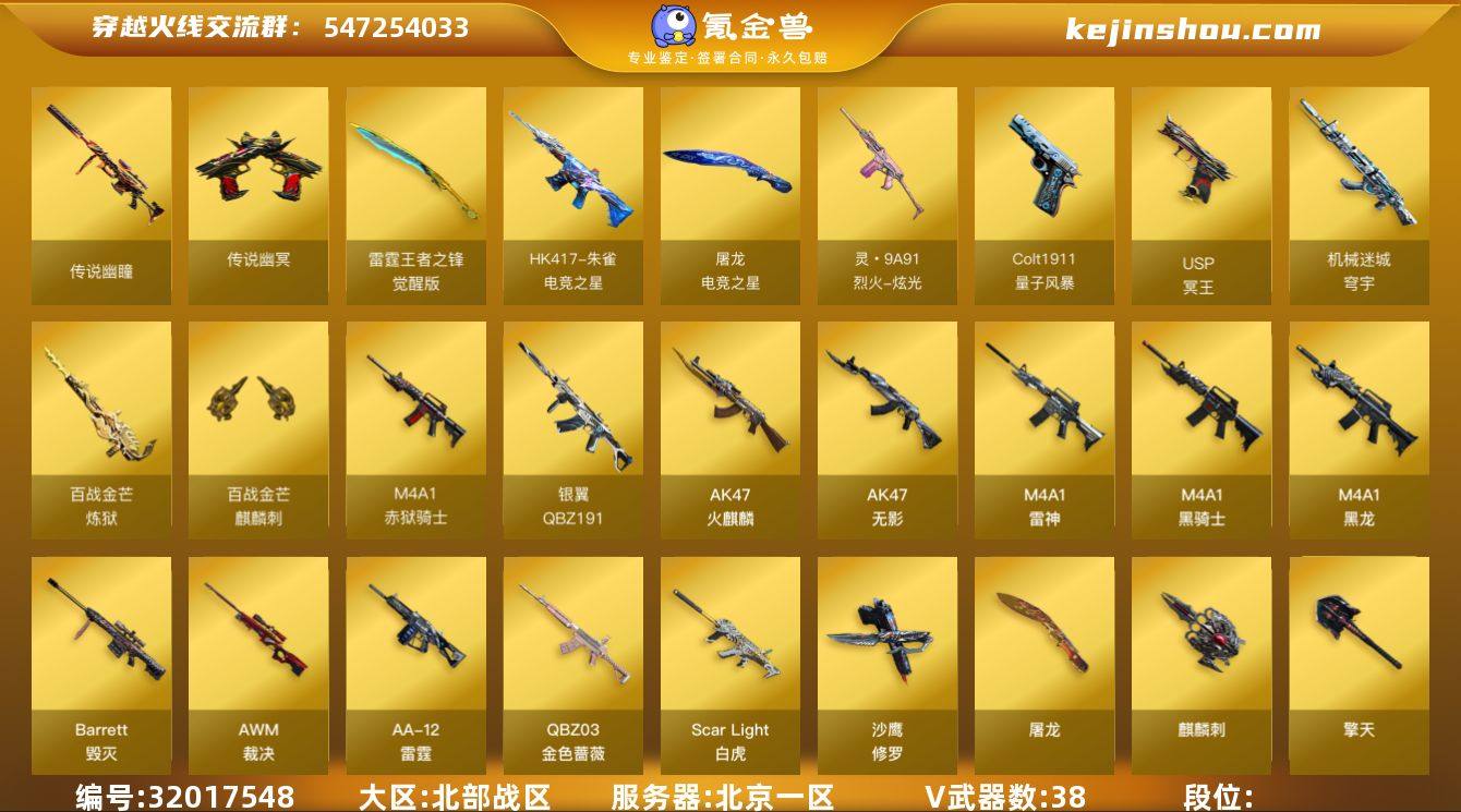 北部战区(北京一区)lb【高质量皮肤号】双传说【传说幽瞳,传说幽冥】38v【M200-竞技荣光,ScarLight-白虎+音效卡,QBZ191-银翼,QBZ03-金色蔷薇+双皮/破浪逐光/量子蔷薇,AWM-裁决+皮/运输船,USP-冥王,炽芒蝶刃+皮/破浪逐光,ScarLight-马枪,猫猫手套】2王者【王者凤吟,雷霆王者之锋】9角色【四防晴雅,四防研,零·纪元,幻面灵狐,葵-阿尔法武装,奇洋探员,乔伊教练,修道士,云海玲珑】10音效【ScarLight-白虎音效卡,M4A1-雷神音效卡,M4A1-黑骑士音效卡,炼狱-百战金芒-庆典舞曲音效卡,HK417-朱雀-电竞之星-竞星悦动音效卡,屠龙-电竞之星-竞星悦动音效卡,Barrett-碧霄极光音效卡】16皮【幻神-星火小队签名臻藏版,星神-巅峰荣耀,金色蔷薇-破浪逐光,金色蔷薇-量子蔷薇,屠龙-破浪逐光,炽芒蝶刃-破浪逐光,黑龙-冠军之武,雷神-宇航兔,裁决-运输船,擎天-冠军之击,黑骑士-冠军之势,火麒麟-传奇EVEN,雷神-神秘按键,毁灭-SV-CFPLS16冠军】【vip5】截图展示段位不代表实际段位 如赛季更新等不可抗拒因素发生变化、时限道具不保证所剩时间