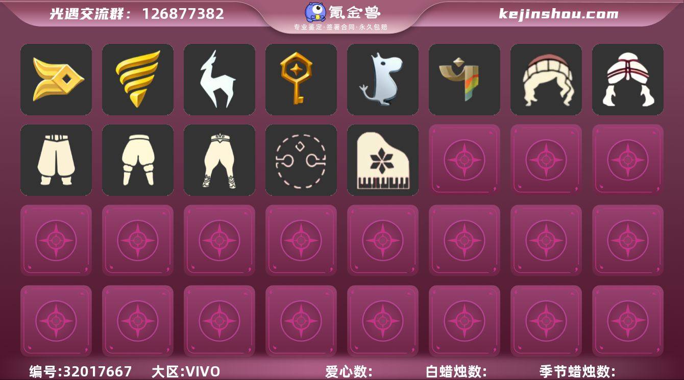 蜡烛数量:37 爱心数量:75 季节蜡烛数量:0 翼数量:124 梦想季,集结季,小王子季,潜海季,表演季,追忆季,夜行季,九色鹿季,二重奏季,姆明季 奉献斗篷,瑞雪斗篷,水母斗篷,半边围巾斗篷,二级毕业礼斗篷,红绒斗篷,白绒斗篷,舰长棕绒斗篷,渔夫斗篷,黑边红绒斗篷,老兵斗篷,蟑螂斗,黑金,白金,红金,绿芽,圣诞斗,万圣斗,海洋斗,彩虹斗,樱花斗,紫罗兰斗,郁金香斗,马蹄莲斗,暗彩斗 郡主发型,冥龙长辫,小王子发型,王冠,小丑头套,绿带麻花辫,斜刘海发型,红色包头巾,老兵凌乱发型,歪啾啾发型,公主头,武士发型,雪人发型,脏辫发型,水母头发型,秃头发型,总裁发型,长发脏辫,渔夫马尾圆帽,半边脏辫绑发,白枭,公主,蝴蝶结,正太,书虫,高马尾,粗辫,虚荣,花环,若笠,明制,樱花,猫耳,女巫,圣诞帽,绒帽,虎狮,丸子盘发 猎手长袍,采药人裤,妮妮裙子,透明裤子,渔夫裤子套装,武士裤,白棉裤,搓澡巾,灯笼裤,紧身裤,连体裤,邮差裤,雪人裤,背带裤,击剑裤,王子服 胡子面具,玫瑰面具,蛇年面具,牛头面具,忧郁脸面具,右眼泪痕面具,右眼竖纹面具,夜行毕业面具,受伤面具,老兵胡子面具,裂纹面具,老头面具,凤凰面具,白鸟面具,小胡子面具,扁嘴雀面具,红狐狸,黄鼠狼,矮人面具,黑脸,六芒星面具,九色鹿面具,牛头,龙头,兔头,玫瑰花面具 飘带耳坠,羽毛耳环,彩虹耳坠,红耳机 乐器,冥龙号角,贝斯乐器,集结季火炬,花盆,鲲灯,螃蟹背饰,遥鲲玩偶,风铃,小风车,琵琶,木琴,大铃铛乐器,手持小铃铛,相机,姆明季帐篷,小红伞,姆明抱枕,姆明全家福,玫瑰花,雨伞,笛子,吉他,高音钢琴,火盆,烟花棒,帐篷,拱门,圣诞椅,万圣椅,蹦迪灯,气球,礼炮,坐垫,海螺,爱心抱枕,七夕挂饰,向日葵,三角钢琴,大提琴,彩色大提琴,二重奏挂画 樱花头饰,古代发饰,采药人帽,国王面具,平顶帽,唐僧帽,渔夫帽,红色耳机,明制帽,红色牛角,草帽,橘绒圆帽,小鸟头饰,羽毛发卡,羽毛装饰,猫猫头套,生日帽,贝雷帽,皇冠,蓝色音乐会,魔术帽,螃蟹南瓜,合服头饰,金箍 优雅领结,夜行季绒毛围脖,九色鹿季节项链,螃蟹肩饰,小王子季节项链,表演季节项链,集结季节项链,姆明季围巾,铃铛,二重奏季项链,黑色领结,布条斗篷,追忆季节项链,围巾,风行毛领,海螺项链,海龟项链,圣诞领结,海浪围巾 毛靴,布鞋,姆明季·鞋子 有友帽子,青衫落拓礼包,奉献斗篷,蝙蝠套,巫师,绊爱,鹿角,蜘蛛斗,瑞雪,雪花球,绒帽,橘子,贝壳,南瓜,雪花,猫套,彩虹耳钉,海螺,四叶草,火焰眼镜,雪人鞋,创始人,满月耳坠 卖家说:出光遇伪梦想不断白枭玫瑰b渠号sky中礼