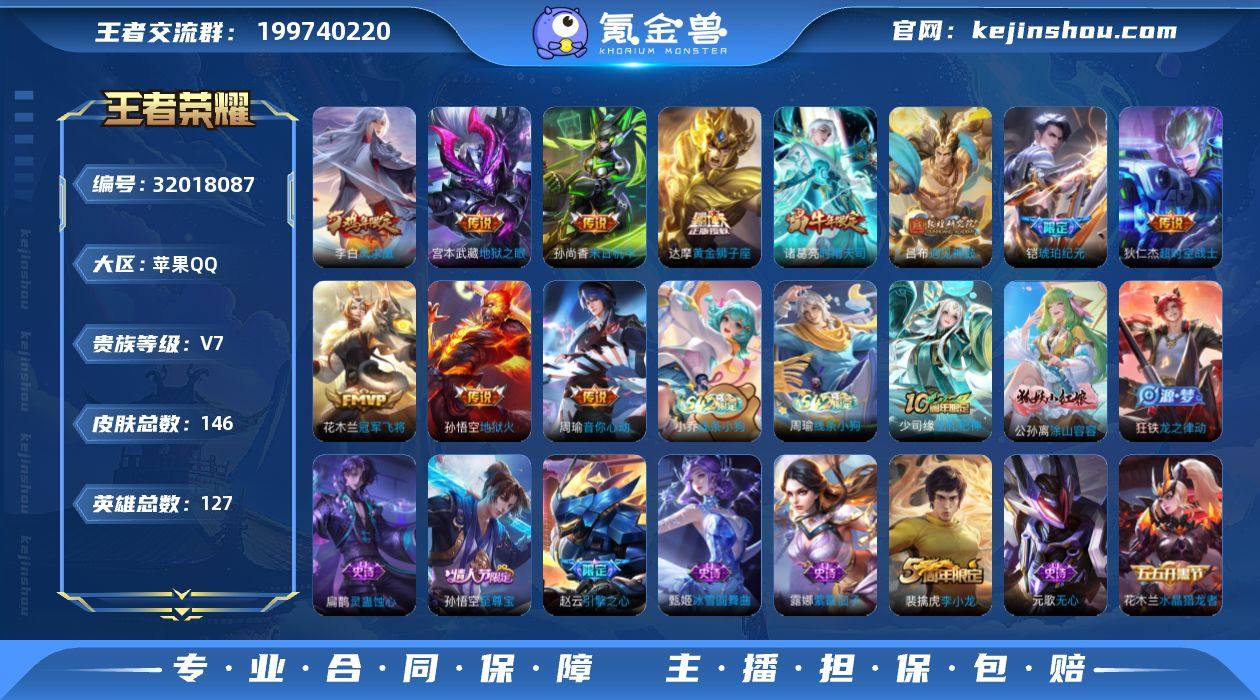 实名: 可修改 性别: 男号 贵族等级: V7 英雄数: 127 皮肤数: 146 传说皮: 黄金狮子座,冠军飞将,末日机甲-孙尚香,地狱火,地狱之眼,音你心动-周瑜,超时空战士-狄仁杰,遇见神鼓,琥珀纪元铠 限定皮: 李小龙,时雨天司,引擎之心,逐梦之音,逐梦之影,凤求凰,至尊宝,降魔 亮点: 【优质装备】:黄金狮子座,冠军飞将,末日机甲-孙尚香(绿蚂蚱),地狱火,地狱之眼,音你心动-周瑜,超时空战士-狄仁杰,遇见神鼓,琥珀纪元铠,涂山容容