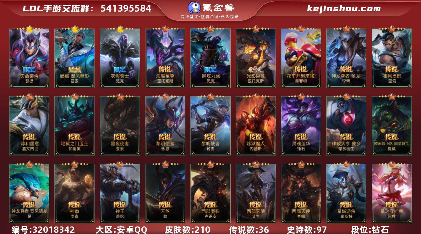 实名: 可修改 段位: 钻石 皮肤数: 210 神话皮: 灰烬骑士派克,臻藏御风墨影 亚索,天命豪侠 瑟提 限定皮肤: 水晶玫瑰永恩,山海绘卷剑魔,山海绘卷狗熊,掠星魔刃,斩星魔剑 传说皮: 地狱之门卫士,黑夜使者亚索,黎明使者锐雯,炼狱魔犬,律政大亨,欧米伽小队 幽灵特工,神龙尊者 驭风啸龙,神拳盲僧,神王盖伦,天煞劫,西部魔影卢锡安,西部天使寒冰,西部天使赛娜,星域游侠卡牌,星之守护者阿狸,驯龙炮手,源计划:联合,战斗学院ez,灵魂莲华锤石,黎明使者永恩,源计划:林,源计划:泯灭,斗魂无双亚索,霸天零式塞恩,星域武神贾克斯,灵魂莲华阿狸,灵魂莲华腕豪,心之钢凯隐,源计划:毁灭,光影巨翼亚托克斯,淳和墨意 嘉文四世,御风墨影 亚索,神龙尊者 圣龙 李青,花车开起来咯 墨菲特,魄炼九幽 派克,海魔至尊 亚托克斯 亮点: 【优质装备】:黑夜使者亚索,黎明使者锐雯,炼狱魔犬,律政大亨,欧米伽小队 幽灵特工,神龙尊者 驭风啸龙,神拳盲僧,神王盖伦,天煞劫,西部魔影卢锡安,西部天使寒冰,西部天使赛娜,星域游侠卡牌,星之守护者阿狸,驯龙炮手,源计划:联合,战斗学院ez,玉剑传说 武剑仙,灵魂莲华锤石,源计划:林,源计划:泯灭,霸天零式塞恩,星域武神贾克斯,灰烬骑士派克,灵魂莲华阿狸,灵魂莲华腕豪,心之钢凯隐