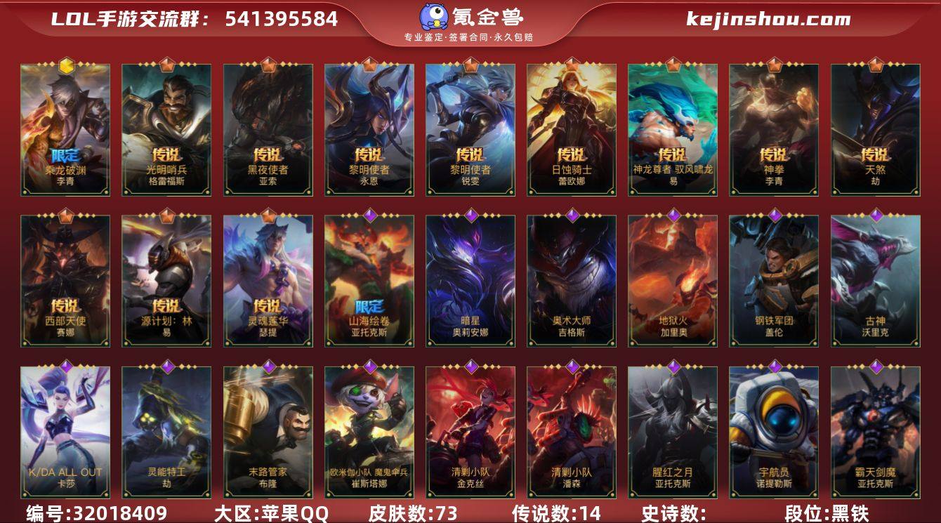 MLL1459【1神话 14传说】苹果Q-86英雄-73皮肤-14传说 段位:黑铁【神话】乘龙破渊李青【传说】西部天使赛娜 天煞劫 海魔至尊亚托克斯 战斗学院凯特琳 黑夜使者亚索 神拳李青 灵魂莲华瑟提 黎明使者锐雯 黎明使者永恩 源计划:联合艾希 源计划:林易 神龙尊者驭风啸龙易 日蚀骑士蕾欧娜 光明哨兵格雷福斯【皮肤】日蚀骑士蕾欧娜 黑夜使者亚索 黎明使者锐雯 神龙尊者 驭风啸龙 神拳盲僧 天煞劫 西部天使赛娜 黎明使者永恩 源计划:林 光明哨兵格雷福斯 灵魂莲华腕豪 清剿小队金克丝 末路管家 欧米伽小队 魔鬼伞兵 清剿小队潘森 古神狼人 宇航员泰坦 霸天剑魔亚托克斯 腥红之月剑魔 山海绘卷剑魔 K/DA ALL OUT卡莎 灵能特工劫 钢铁军团 暗星发条 奥术大师吉格斯 地狱火加里奥 s1光耀之刃 s6绯金丽刃 s7绯金战斧 s8绯金鮫灵 s9王牌舰长