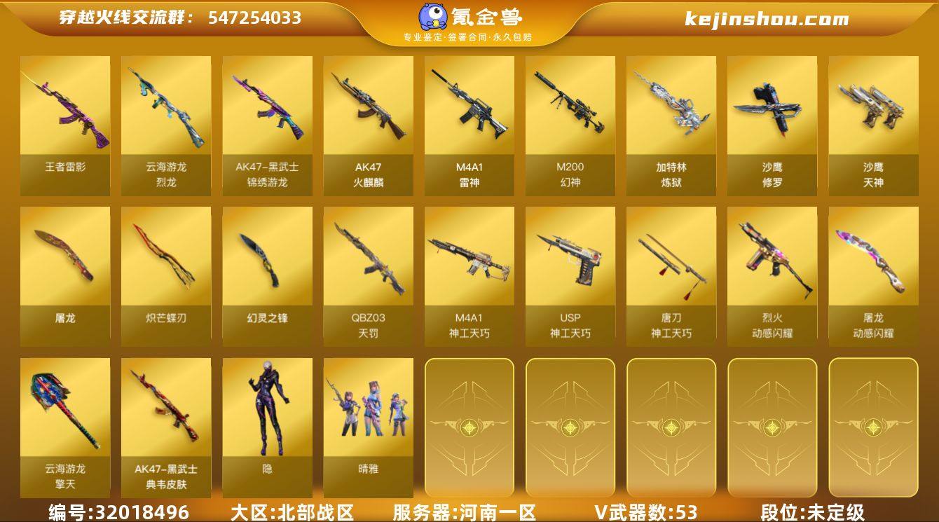 河南一区-59V-6王者武器数-0炫金武器数 【热门武器】:M200-幻神,QBZ03-街机,加特林-炼狱,沙鹰-修罗,炽芒蝶刃 【王者炫金武器】:王者雷影 【音效卡】:炼狱-百战金芒-庆典舞曲音效卡,死神-雪域霜狐-怀旧音效卡 【皮肤】:M200-幻神-荣耀世冠白鲨,M4A1-再燃火线,黑武士-典韦皮肤,轻型军用手斧-再燃火线 【角色】:晴雅,隐,零·纪元,战地猎狐,雪域霜狐,奇洋探员,乔伊教练,云海玲珑,葵-阿尔法武装,暗夜-X,初恋灵狐,飞虎队-X,嘉年华灵狐,卡塔琳娜,兰-新年限定,灵狐者-X,麻雀,潘多拉-X,铁骑荣耀,兔囡囡,游珑儿 【人偶武器】:AWM-灵狐-15周年嘉年华,迷你深渊冰龙,迷你波特博士*2,迷你生化手雷,深渊终结者手雷,迷你巨石泰坦-魔花研究所 【暴走生化】:KAC-狂怒咆哮,超级对讲机 【挑战大师】:冰龙粉碎者-白马银枪,激光毁灭者III-白马银枪*2 【英雄级武器】:AK47-火麒麟,M4A1-雷神,QBZ03-天罚,M4A1-神工天巧,黑武士-锦绣游龙,FAMAS G2-天戎,死神-雪域霜狐,烈火-动感闪耀,王者之烈-觉醒版,QBZ-03-王者蔷薇-觉醒版,白虎之魄-觉醒版,M200-幻神,王者之光-觉醒版,王者星神-觉醒版,加特林-炼狱,烈龙-云海游龙,沙鹰-修罗,沙鹰-天神,USP-神工天巧*3,COP 357-雪域霜狐,USP-冥王,天神-动感闪耀,修罗-云海游龙,屠龙,幻灵之锋,炽芒蝶刃,唐刀-神工天巧,屠龙-动感闪耀,擎天-云海游龙,龙啸-热带奇洋,麒麟刺-百战金芒,高爆手雷-幻灵,高爆手雷-神工天巧*6,手雷-动感闪耀,手雷-云海游龙,手雷-热带奇洋,闪光弹-幻灵,闪光弹-神工天巧*6,烟雾弹-幻灵,烟雾弹-神工天巧*4,M4A1-赤狱骑士 【道具】:EP战队炫彩背包,云海游龙炫彩背包,亚洲杯纪念炫彩背包,奇洋探员-海龟背包,女皇终结者-背包,百战金芒炫彩背包,虎牙炫彩背包,超级背包,雪域霜狐炫彩背包,救世...