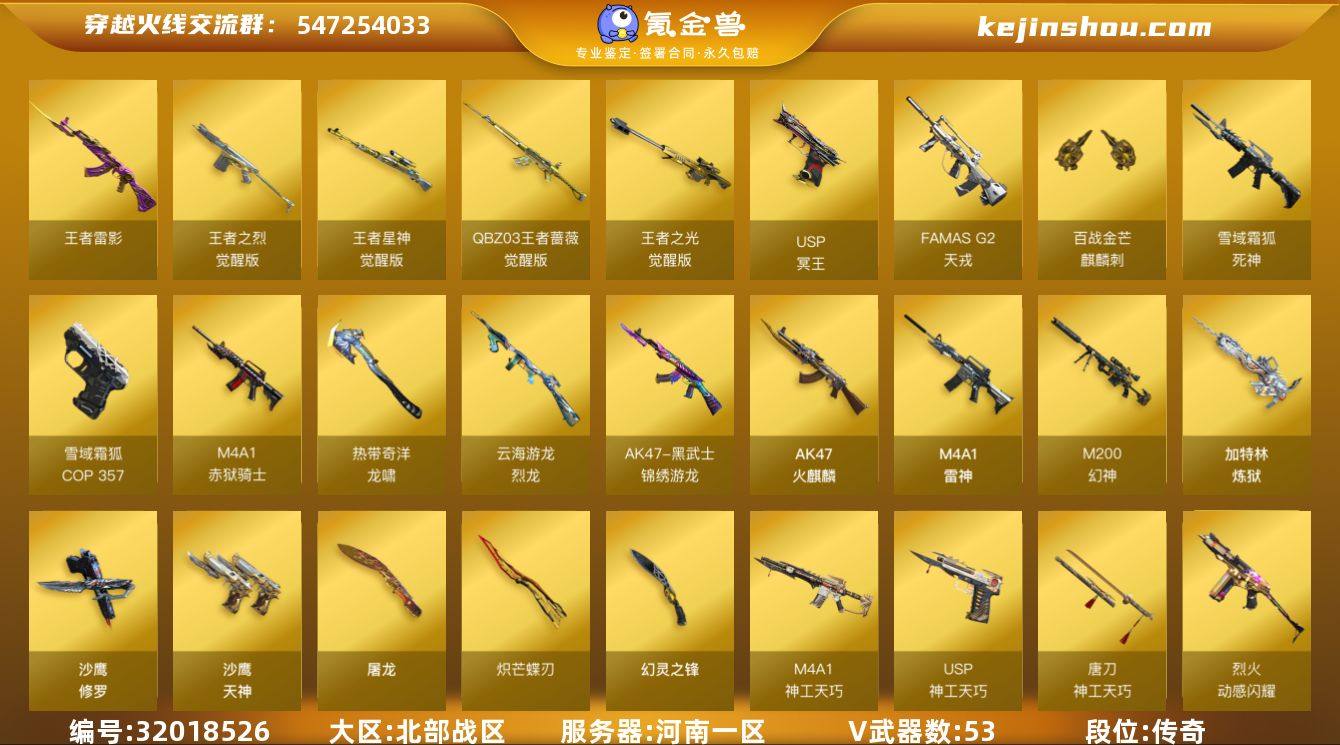 河南一区-59V-6王者武器数-0炫金武器数 【热门武器】:M200-幻神,QBZ03-街机,加特林-炼狱,沙鹰-修罗,炽芒蝶刃 【王者炫金武器】:王者雷影 【音效卡】:炼狱-百战金芒-庆典舞曲音效卡,死神-雪域霜狐-怀旧音效卡 【皮肤】:M200-幻神-荣耀世冠白鲨,M4A1-再燃火线,黑武士-典韦皮肤,轻型军用手斧-再燃火线 【角色】:晴雅,隐,零·纪元,战地猎狐,雪域霜狐,奇洋探员,乔伊教练,云海玲珑,葵-阿尔法武装,暗夜-X,初恋灵狐,飞虎队-X,嘉年华灵狐,卡塔琳娜,兰-新年限定,灵狐者-X,麻雀,潘多拉-X,铁骑荣耀,兔囡囡,游珑儿 【人偶武器】:AWM-灵狐-15周年嘉年华,迷你深渊冰龙,迷你波特博士*2,迷你生化手雷,深渊终结者手雷,迷你巨石泰坦-魔花研究所 【暴走生化】:KAC-狂怒咆哮,超级对讲机 【挑战大师】:冰龙粉碎者-白马银枪,激光毁灭者III-白马银枪*2 【英雄级武器】:AK47-火麒麟,M4A1-雷神,QBZ03-天罚,M4A1-神工天巧,黑武士-锦绣游龙,FAMAS G2-天戎,死神-雪域霜狐,烈火-动感闪耀,王者之烈-觉醒版,QBZ-03-王者蔷薇-觉醒版,白虎之魄-觉醒版,M200-幻神,王者之光-觉醒版,王者星神-觉醒版,加特林-炼狱,烈龙-云海游龙,沙鹰-修罗,沙鹰-天神,USP-神工天巧*3,COP 357-雪域霜狐,USP-冥王,天神-动感闪耀,修罗-云海游龙,屠龙,幻灵之锋,炽芒蝶刃,唐刀-神工天巧,屠龙-动感闪耀,擎天-云海游龙,龙啸-热带奇洋,麒麟刺-百战金芒,高爆手雷-幻灵,高爆手雷-神工天巧*6,手雷-动感闪耀,手雷-云海游龙,手雷-热带奇洋,闪光弹-幻灵,闪光弹-神工天巧*6,烟雾弹-幻灵,烟雾弹-神工天巧*4,M4A1-赤狱骑士 【道具】:EP战队炫彩背包,云海游龙炫彩背包,亚洲杯纪念炫彩背包,奇洋探员-海龟背包,女皇终结者-背包,百战金芒炫彩背包,虎牙炫彩背包,超级背包,雪域霜狐炫彩背包,救世...
