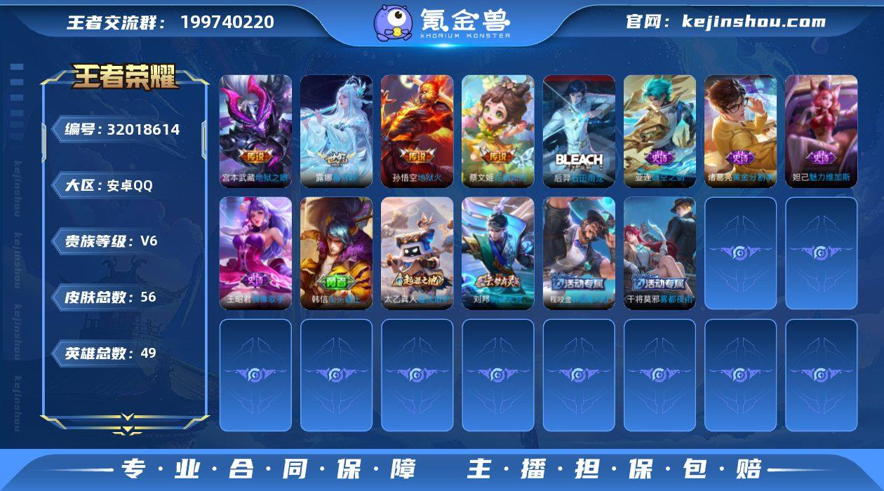 神骥越千峰·神骥聚万邦·霜月吟·白虎志】【可二次】w17729-安卓Q-49英雄-56皮肤-3王者印记-25铭文-贵族积分1w【贵族6】【1珍品·11传说·4按键】【因赛季更新游戏段付以上号为准!】 【英雄全皮】:孙权全皮 【珍品传说】:伽罗沧流箭 【传说皮肤】:云缨神骥越千峰,貂蝉神骥聚万邦,花木兰异界灵契,后羿神树通天,桑启鸣野蒿,露娜霜月吟,蔡文姬花朝如约,百里玄策白虎志,李白凤求凰,宫本武藏地狱之眼,孙悟空地狱火 【限定皮肤】:赵云皇家上将,狄仁杰魔术师,项羽海滩派对,百里玄策白虎志,刘邦剑破天穹,程咬金群星魔术团 【年限皮肤】:李白凤求凰,百里玄策白虎志 【赛季限定】:刘邦剑破天穹,太乙真人谧流熔炉 【战令限定】:亚连破空之剑,周瑜线条小狗,小乔线条小狗 【史诗皮肤】:明世隐百晓客,周瑜线条小狗,小乔线条小狗,后羿石田雨龙,亚连破空之剑,诸葛亮黄金分割率,妲己魅力维加斯,狄仁杰魔术师,王昭君偶像歌手,赵云皇家上将,露娜紫霞仙子 【其他皮肤】:吕布舞狮寰,鲁班七号班班快跑,桑启线条小狗,蚩奼极光幻客,艾琳鹤鸣心笺,孙权径山谋武,太乙真人谧流熔炉,干将莫邪雾都夜雨,程咬金群星魔术团,刘邦剑破天穹,后羿完美运算,亚连破局者,诸葛亮掌控之力,王昭君幻想奇妙夜,刘备汉昭烈帝,后羿阿尔法小队,宫本武藏万象初新,甄姬花好人间,亚瑟死亡骑士,妲己少女阿狸,宫本武藏未来纪元,赵云白执事,韩信街头霸王,项羽海滩派对,澜孤猎,镜冰刃幻境,伽罗花见巫女,百里守约绝影神枪,诸葛亮星航指挥官,苍维京掠夺者,后羿精灵王,孙悟空西部大镖客,狄仁杰锦衣卫
