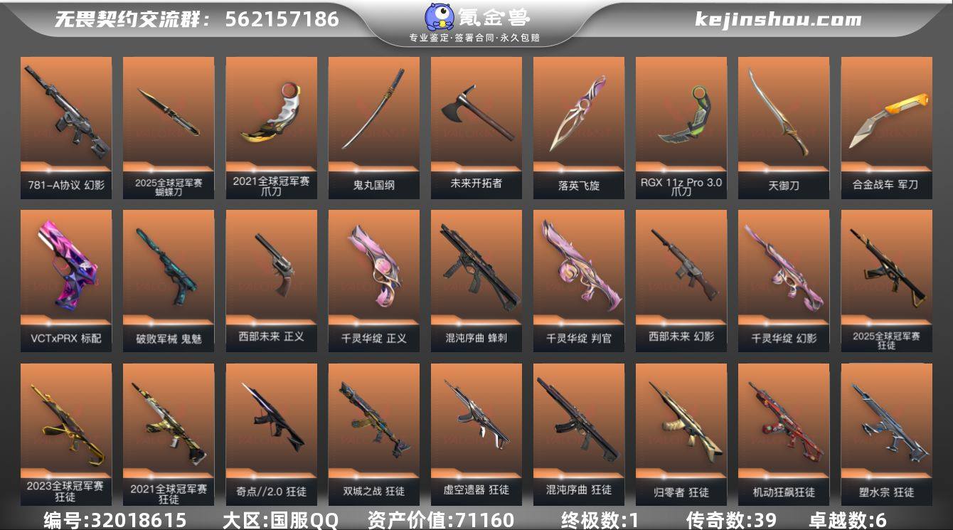 【自带包赔 可赔三倍】:库存价值71160 极品限定21套 23狂徒 25套 双城狂徒 中三段号 市场下三中三选手 性价比超值 【限定】: 2025全球冠军赛 狂徒, 2025全球冠军赛 蝴蝶刀, 双城之战 狂徒, 2021全球冠军赛 狂徒, 2021全球冠军赛 爪刀, 2023全球冠军赛 狂徒 【近战】: 2025全球冠军赛 蝴蝶刀, 未来开拓者, 鬼丸国纲, 天御刀, RGX 11z Pro//3.0 爪刀, 落英飞旋, 2021全球冠军赛 爪刀 【狂徒】: 2025全球冠军赛 狂徒, 虚空遗器 狂徒, 堕天遗武 狂徒, 洪荒怒焰 狂徒, 双城之战 狂徒, 掠影 狂徒, 奇点//2.0 狂徒, 混沌序曲 狂徒, 机动狂飙 狂徒, 2021全球冠军赛 狂徒, 塑水宗 狂徒, 紫阙金琅 狂徒, 归零者 狂徒, 盖亚的复仇 狂徒, 2023全球冠军赛 狂徒 【幻影】: 西部未来 幻影, 千灵华绽 幻影, 般若假面 幻影, 781-A协议 幻影 【冥驹】: 千灵华绽 冥驹, 归零者 冥驹 【正义】: 西部未来 正义, 千灵华绽 正义 【鬼魅】: 破败军械 鬼魅 【标配】: VCT x PRX 标配 【蜂刺】: 混沌序曲 蜂刺 【雄鹿】: 起源 雄鹿 【判官】: 千灵华绽 判官 【飞将】: 西部未来 飞将 【奥丁】: 西部未来 奥丁 【莽侠】: RGX 11z Pro//3.0 莽侠 【概要】: 总皮肤 144 终极 1 传奇 39 卓越 6 刀皮 英雄 28 LV 200 历史最高:钻石 当前段位:未定级 已使用 1495 R点 剩余 175 R点 可二次 卡面、挂饰、其他皮肤请看截图 道具、段位等以实际验号为准。如账号因没有维护,赛季更新等不可抗因素发生变化,不属于账号质量问题"