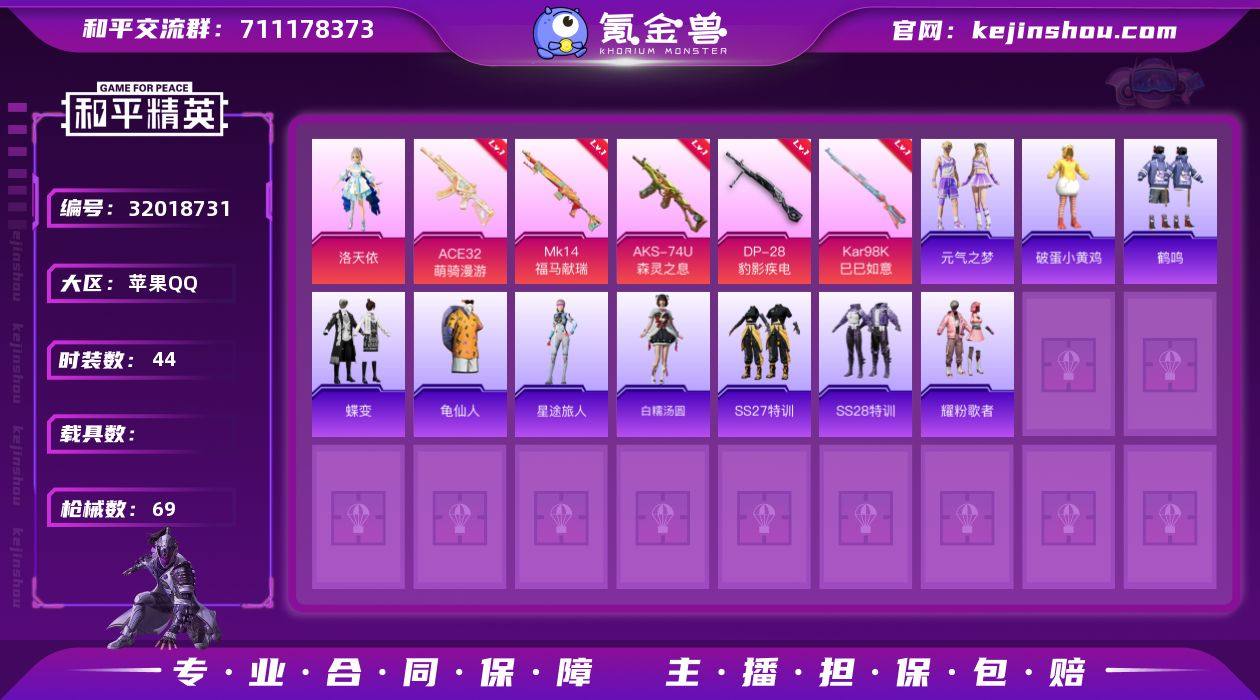 M1046669【特价出售1粉装-5特效枪洛天依】苹果手Q-1粉装-5特效枪-44套装-69枪皮-1王牌印记-坚韧铂金Ⅲ-17277热力值【1粉装】角色-洛天依【5特效枪】Mk14-福马献瑞[5级],DP-28-豹影疾电[5级],AKS-74U-森灵之息[4级],ACE32-萌骑漫游[3级],Kar98K-巳巳如意[4级]【3飞行器】炫彩糖果飞行器,顶峰精英尾迹,马上有福飞行器【107其它衣服和枪皮】SS30特训,滨海厨神,竞技名士,深蓝色名流,耀粉歌者,星途旅人,SS28特训,SS35特训,白糯汤圆,黄色伏地魔,龙魂突击队,空岛之星,缤纷果语,SS36特训,长空猛禽,马上有钱,海岛探路者,SS27特训,蝶变,雨过天青,冷焰舞者,角色-孙斩天,绮丽涂鸦,街头潮人,破蛋小黄鸡,炫彩糖果,白色伏地魔,SS34特训,龟仙人,SS33特训,元气之梦,老实芭蕉,鹤鸣,黑色伏地魔,狙击之神,SS29特训,SS37特训,霓虹街区,竞技达人朋克,灼焰舞者,海盐绵绵冰,红釉青花,福马献瑞,UMP45-蓝色火焰,S686-彩虹符号,破片手榴弹-星途旅人,AUG-天降萌叽,SCAR-L-海盐豹豹,Vector-生命誓言,GROZA-海盐豹豹,UZI-炫彩糖果,汤姆逊-像素花束,AA12-G-雨过天青,SKS-炫彩节奏,UMP45-夜灯,Mk14-冰河战士,20-H-星途旅人,M24-影袭,SCAR-L-炫彩节奏,SCAR-L-星途旅人,AWM-天降萌叽,M16A4-冰河战士,UZI-啾咪啾咪,沙漠之鹰-雨过天青,Mini14-香桃花海,MG3-火熔核心,QBZ-洛神天依,M16A4-雨过天青,S686-生命誓言,GROZA-福马献瑞,突击盾牌-绝对恒星,AMR-雨过天青,AUG-耀粉歌者,AUG-冰晶雪宝,破片手榴弹-爆破雪人,M416-蓝色火焰,PKM-雨过天青,汤姆逊-耀粉歌者,UMP45-生命誓言,GROZA-紫矿核心,蜜獾-天降萌叽,AKM-破晓战魂,M249-金丰海韵,P90-玩趣呆呆,MG3-幻世战舞者,AKM-龙的传人,DP-28-彩虹符号,破片手榴弹-呆爆
