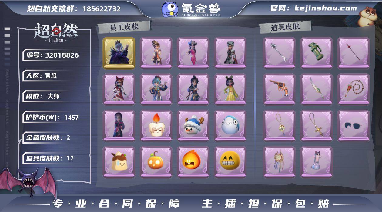 金皮2;紫皮8;道具皮17;皮肤:兰-春之声,零-渡鸦公爵,爱丽丝-丝缕哀歌,逍遥-绣春逍影,小黄-呱呱雨衣,莉莉-莓果陷阱,阿念-迷途僵宝,阿念-庆宴绮愿,爱丽丝-耀眼的你,艾伦-黎明猎手;道具:刺刀-碧络琅环,急救包-蔷薇物语,长枪-罪棘,闪光弹-金戈玄铜,长鞭-缚誓之锁,夜视仪-金丝眼镜,摸金符-海洋之心,音响-鸣沙鼓,音响-happy猫,音响-月光奏鸣曲,转轮手枪-新星时代,铲子-撒拉弗的祷告,摸金符-紫霄,腰包-红运福虎,长枪-波塞冬,额外的背包-灵感泉之花,摸金符-祝祷词;美妆:美妆-听潮祝福;饰品:头饰-雪墩墩头套,头饰-小狗蛇点点头套,头饰-腊肠扭扭,头饰-惊魂南瓜头套,头饰-烈焰红唇头套,头饰-嘻嘻头套,头饰-鱼头怪头套,头饰-烛光纪念,头饰-蒜了八,头饰-哈士奇头套,头饰-火爆了头套,头饰-呆滞头套,头饰-面具马头套,头饰-滑稽头套,头饰-咬咬鲨头套,头饰-马上有钱,头饰-樱桃奶油布丁,头饰-炙热烧烤,头饰-萨卡班甲鱼头套,头饰-卑微头套,头饰-饺饺者头套,头饰-大葱明头套,头饰-太空鲨头套,头饰-像素朋克墨镜,头饰-后室幸存者头套,挂饰-拂云仙,挂饰-不朽的今夜,挂饰-晚安小熊,挂饰-未竟乐园,挂饰-钗头凤,挂饰-九色祥鹿,挂饰-孤独对望,背饰-牛啤背包,背饰-醉花阴,背饰-蝶恋花,背饰-白鼬趴趴,背饰-天使的呼唤;主页装扮:主页装扮-樱落金笺;动作:动作-卡点舞,动作-金城舞,动作-luvaboy,动作-小雨摇,动作-舞台中心,动作-企鹅舞,动作-知世摇,动作-七仔摇,动作-新年摇,动作-鹏友摇,动作-鸳鸯戏,动作-带你逃跑吧,动作-拜年,动作-举牌,动作-蝴蝶步,动作-要糖,动作-抬手,动作-KT猫摇;工牌背景:工牌背景-卷珠帘,工牌背景-点点萌伴,工牌背景-圣光之誓,工牌背景-复活的肖像,工牌背景-春和景明,工牌背景-永夜巡礼,工牌背景-永恒之阶,工牌背景-甜酷指令;工牌动作:工牌动作-蜕变,工牌动作-净禅,工牌动作-鸦影,工牌动作-春色盈怀,工...