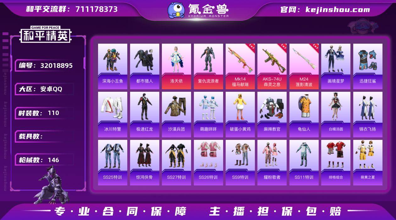 M1046657【地铁满天赋2粉装-3特效枪 都市猎人,深海小丑鱼 鲨鱼裤 洛天依,角色-复仇流浪者】安卓手Q-2粉装-3特效枪-110套装-146枪皮-8王牌印记-超级王牌-41988热力值【2粉装】角色-洛天依,角色-复仇流浪者【3特效枪】AKS-74U-森灵之息[5级],M24-莲影清波[6级],Mk14-福马献瑞[5级]【3稀有】都市猎人,深海小丑鱼,M24-奇异狩猎者【2飞行器】红色滑翔尾迹,登顶巅峰飞行器【1头盔】深海小丑鱼头盔【248其它衣服和枪皮】狙击之神,长空猛禽,酸甜橘柚,深蓝色名流,金鼠迎春,龟仙人,飞驰魅影,疯狂小兔子,SS35特训,甜蜜告白,魅力单车,沙漠兵团,惊鸿侠骨,极速红龙,SS27特训,湖蓝色名流,雨过天青,橘黑制服,SS10特训,白糯汤圆,都市魅力,白色伏地魔,幻世战舞者,夏日音浪,冰川特警,灼焰舞者,琴音绮想,酒红色名流,飞行日记,SS8特训,SS26特训,完美偶像,SS21特训,战地督导,绮丽涂鸦,炫蓝之夏,SS13特训,SS16特训,虚音幻奏,探宝勇士,福马献瑞,雪国风尚,SS37特训,迅捷狂鲨,田园牧歌,竞技达人朋克,黄色名流,牛气满满,萌黄之夏,破晓战魂,猎鹰,潮流炫酷,元素星魂,吉莉礼服,黄色运动,SS23特训,破蛋小黄鸡,SS9特训,马上来财,画境星梦,轻风白浪,SS36特训,青翼流星,绯格组合,耀粉歌者,SS20特训,萌趣咩咩,麻辣教官,SS12特训,猛禽,SS22特训,红色运动,青年教官,SS17特训,黑色伏地魔,牛气冲天,SS19特训,SS15特训,音速流光,黄色伏地魔,柠萌假日,娇憨猪猪,蓝彩潮人,锦衣飞扬,蓝色运动,特训学院,街头潮人,黎明保卫者,甜心亚梦,人气偶像,SS14特训,冷焰舞者,SS11特训,萌趣颜团子,竞技名士,红釉青花,甜蜜菠萝,天籁歌者,SS25特训,幻影武者,酷潮明星,雪兔飞飞,极地朋克,弄潮海豚,街头风暴,SS18特训,AMR-雨过天青,VSS-田园牧歌,Mini14-耀粉歌者,平底锅-甜心亚梦,MG3-乌木金纹,SLR-彩虹符号,AWM-恐龙拽拽,20-H-狂鲨锋刃,