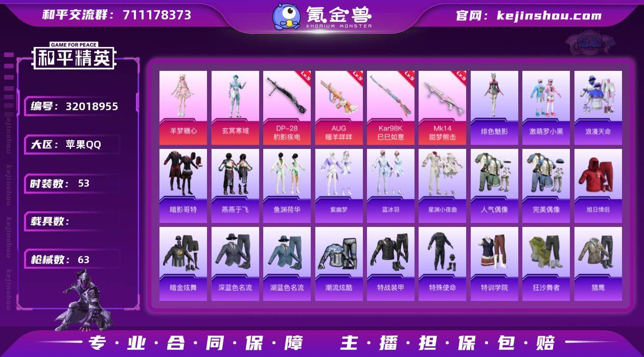 无二次-苹果 手Q-2粉装-6特效枪-0载具-2粉色飞行器-19527热力值-2王牌印记-53套装-63枪皮HZ263212 【热门品类】:套装-浪漫天命,套装-暗影哥特 【粉色套装】:角色-玄冥寒域,角色-羊梦糖心 【粉色枪皮等级】:AUG-暖羊咩咩(五级),UMP45-萌骑冒险(四级),AKS-74U-森灵之息(四级),Kar98K-巳巳如意(五级),Mk14-甜梦熊击(五级),DP-28-豹影疾电(五级) 【粉色枪皮】:AUG-暖羊咩咩,UMP45-萌骑冒险,AKS-74U-森灵之息,Kar98K-巳巳如意,Mk14-甜梦熊击,DP-28-豹影疾电 【粉色飞行器】:炫彩糖果飞行器,戏水时光飞行器 【粉色降落伞】:炫紫旋律降落伞,萌酷奶龙降落伞,樱桃泡泡降落伞,星穹咏叹调降落伞,炫彩糖果降落伞 【稀有套装】:套装-雪国风尚,套装-炫彩糖果,套装-燕燕于飞,套装-鱼渊荷华,套装-紫幽梦,套装-蓝冰羽,套装-星渊小夜曲,角色-绯色魅影 【稀有枪皮】:SCAR-L-玉兔迎春,SCAR-L-红色方程式,M416-仓鼠灰灰,M416-红色方程式,GROZA-懵萌河马,M762-镭射皇者,P90-飞驰魅影,Kar98K-星穹咏叹调,S686-生命誓言,S12K-玩趣呆呆,DBS-彩虹符号,DP-28-彩虹符号,MG3-幻世战舞者 【其他套装】:套装-人气偶像,套装-完美偶像,套装-旭日情侣,套装-暗影哥特,套装-暗金炫舞,套装-浪漫天命,套装-深蓝色名流,套装-湖蓝色名流,套装-潮流炫酷,套装-特战装甲,套装-特殊使命,套装-特训学院,套装-狂沙舞者,套装-猎鹰,套装-猛禽,套装-白色伏地魔,套装-竞技达人朋克,套装-缤纷果语,套装-蓝色运动,套装-酒红色名流,套装-青年教官,套装-黄色伏地魔,套装-黄色名流,套装-黄色运动,套装-黑色伏地魔,套装-漫步者,套装-弄潮海豚,套装-激萌罗小黑 【稀有头盔】:幻影战神头盔(2级),深海小丑鱼头盔(3级) 【营地ID】:924397533