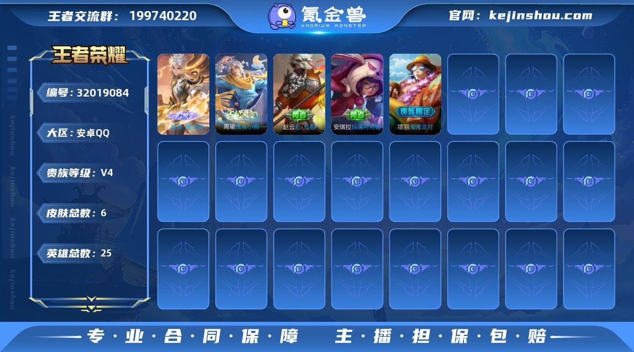 MWZ105324【V4 1无双】安卓Q-6皮肤-25英雄 【无双皮肤】 器灵·螭龙剑 【史诗皮肤】 线条小狗 【勇者皮肤】 海滩派对 忍·炎影 玩偶对对碰 【稀有英雄】 橘右京 赵云 营地ID:1547958338