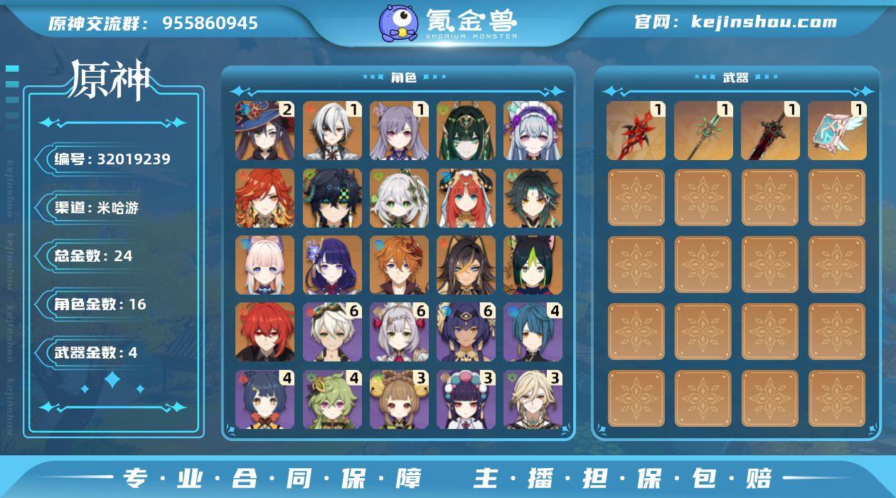 冒险等级:56 总黄数:24 5星角色数:16 5星武器数:4 原石数量:119 相遇之缘数量:0 纠缠之源数量:0 2命莫娜,1命阿蕾奇诺,1命刻晴,0命奈芙尔,0命梦见月瑞希,0命玛薇卡,0命基尼奇,0命纳西妲,0命妮露,0命魈,0命珊瑚宫心海,0命雷电将军,0命达达利亚,0命迪希雅,0命提纳里,0命迪卢克 6命班尼特,6命坎蒂丝,6命诺艾尔,4命香菱,4命行秋,4命柯莱,3命卡维,3命瑶瑶,3命云堇,2命赛索斯,2命九条裟罗,2命辛焱,2命烟绯,1命爱诺,1命菲米尼,1命卡齐娜,1命欧洛伦,1命重云,1命多莉,1命珐露珊,1命菲谢尔,1命凯亚,1命凝光,1命砂糖,1命五郎,0命叶洛亚,0命嘉明,0命琳妮特,0命绮良良,0命伊安珊,0命伊法,0命安柏,0命芭芭拉,0命迪奥娜,0命丽莎,0命罗莎莉亚,0命莱依拉,0命鹿野院平藏,0命托马,0命早柚 精1赤月之形,精1和璞鸢,精1狼的末路,精1天空之卷 100%侦察骑士,星与月之约,叶隐芳名,致教会自由人 卖家说:挺欧的