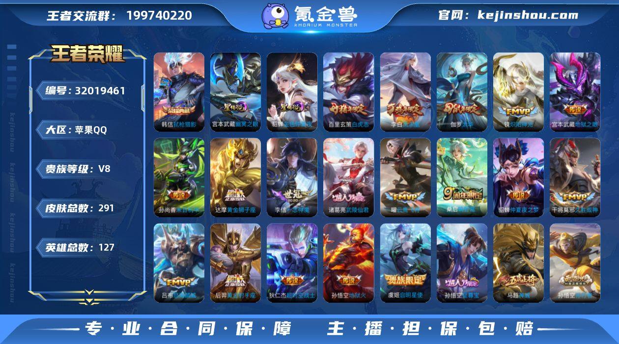 V8 1典藏 18传说 2星元 291皮肤 127英雄 【1水晶】韩信-弑枪猎影【18传说】百里玄策-白虎志,达摩-黄金狮子座,狄仁杰-超时空战士,貂蝉-仲夏夜之梦,伽罗-太华,干将莫邪-久胜战神,宫本武藏-地狱之眼,后羿-黄金射手座,镜-炽阳神光,李白-凤求凰,李信-一念神魔,孙尚香-末日机甲,孙悟空-地狱火,虞姬-启明星使,诸葛亮-武陵仙君,吕布-怒海麟威,曜-云鹰飞将,桑启-鸣野蒿【2星元】宫本武藏-幽冥之眼,貂蝉-金色仲夏夜之梦【79史诗】元歌-无心,赵云-未来纪元,澜-赏金猎手,夏洛特-永昼,阿轲-暗夜猫娘,阿轲-节奏热浪,安琪拉-心灵骇客,安琪拉-时之奇旅,白起-星夜王子,百里守约-特工魅影,百里守约-朱雀志,百里玄策-原初追逐者,不知火舞-魅语,蔡文姬-舞动绿茵,曹操-幽灵船长,蔡文姬-繁星吟游,程咬金-功夫厨神,妲己-女仆咖啡,妲己-魅力维加斯,狄仁杰-魔术师,狄仁杰-鹰眼统帅,貂蝉-圣诞恋歌,伽罗-天狼溯光者,干将莫邪-真爱魔法,公孙离-蜜橘之夏,公孙离-无限星赏官,宫本武藏-鬼剑武藏,关羽-冰锋战神,韩信-白龙吟,韩信-逐梦之影,花木兰-水晶猎龙者,花木兰-青春决赛季,橘右京-修罗,黄忠-火炮绅士,铠-曙光守护者,兰陵王-暗隐猎兽者,兰陵王-驯魔猎人,老夫子-航海奇遇记,李白-千年之狐,李元芳-逐浪之夏,廉颇-地狱岩魂,刘邦-德古拉伯爵,刘禅-绅士熊喵,刘禅-天才门将,露娜-紫霞仙子,鲁班七号-狮舞东方,吕布-圣诞狂欢,马超-神威,马可波罗-逐梦之星,蒙犽-狂想玩偶喵,米莱狄-胡桃异想国,墨子-金属风暴,上官婉儿-梁祝,裴擒虎-李小龙,司马懿-暗渊魔法,孙策-猫狗日记,孙尚香-水果甜心,孙悟空-大圣娶亲,孙悟空-至尊宝,孙悟空-孙行者,王昭君-偶像歌手,夏侯惇-乘风破浪,项羽-苍穹之光,小乔-缤纷独角兽,雅典娜-黎明之约,嬴政-优雅恋人,嬴政-白昼王子,元歌-云间偶戏,云中君-纤云弄巧,张飞-乱世虎臣,赵云-皇家上将,赵云-引擎之心,甄姬-冰雪圆舞曲,诸葛亮-黄...