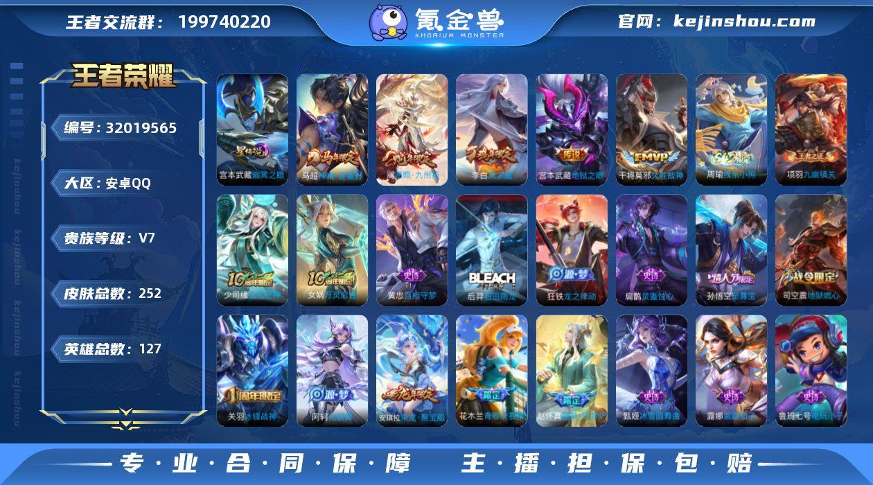 贵族等级:V7 典藏皮肤数:0 珍品无双皮肤数:0 无双皮肤数:0 珍品传说皮肤数:0 传说皮肤数:5 史诗皮肤数:64 皮肤数:252 英雄数:127 段位:无双王者