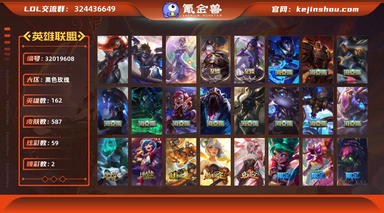 未定级段位-162英雄-587皮肤-59炫彩-3终极-15神话-54限定-70传说-188史诗 【神话皮肤】:十周年纪念安妮,源代码乐芙兰,海克斯科技阿利斯塔,海克斯科技安妮,海克斯科技波比,海克斯科技嘉文四世,海克斯科技克格莫,海克斯科技雷克顿,海克斯科技玛尔扎哈,恐惧新星德莱厄斯,零之枪骑赫卡里姆,摄魂使者薇恩,新创战纪希维尔,至臻灵魂莲华易,至臻源计划正义艾瑞莉娅 【至臻皮肤】:至臻灵魂莲华易,至臻源计划正义艾瑞莉娅 【臻彩皮肤】:源计划火菲奥娜惩戒 【年限皮肤】:美猴王孙悟空,春晖神女拉克丝,剪纸仙灵艾瑞莉娅 【海克斯皮肤】:海克斯科技安妮,海克斯科技阿利斯塔,新创战纪希维尔,海克斯科技雷克顿,海克斯科技嘉文四世,摄魂使者薇恩,海克斯科技波比,海克斯科技玛尔扎哈,海克斯科技克格莫,零之枪骑赫卡里姆,恐惧新星德莱厄斯 【冰雪限定】:幸福女神乐芙兰,冰雪风暴希维尔,圣诞开心鬼提莫,圣诞精灵崔丝塔娜,圣诞狂欢努努和威朗普,圣诞狂欢基兰,阿木木“主人不要我了”,平安夜女神娑娜,夺命美人卡特琳娜,喜庆之树茂凯,圣诞玩偶波比,圣诞老人古拉加斯,圣诞驯鹿克格莫,魄罗骑士瑟庄妮,雪球也能爆炸吉格斯,寒冬精灵璐璐,冰雪节辛吉德,冰雪兽纳尔 【终极皮肤】:大元素使拉克丝,未来战士伊泽瑞尔,武装战姬厄运小姐 【限定皮肤】:冠军典狱长锤石,冠军之血希瓦娜,冠军之隐劫,Fnatic古拉加斯,Fnatic迦娜,暗杀星蒙多,SKTT1婕拉,SSW图奇,SSW锤石,SKTT1雷克顿,SKTT1扎克,iG卡莎,EDG格雷福斯,EDG佐伊,EDG厄斐琉斯,海珀利安小队Z01猎户座卢锡安,胜利之剑亚托克斯,胜利枪神卢锡安,胜利机器人布里茨,胜利女神瑟庄妮,胜利凤凰艾尼维亚,海贼瑞兹,灵魂收割者索拉卡,鬼影重重魔腾,鬼影森森茂凯,无头骑士赫卡里姆,魅惑女巫莫甘娜,泳池派对蕾欧娜,波比的巧...