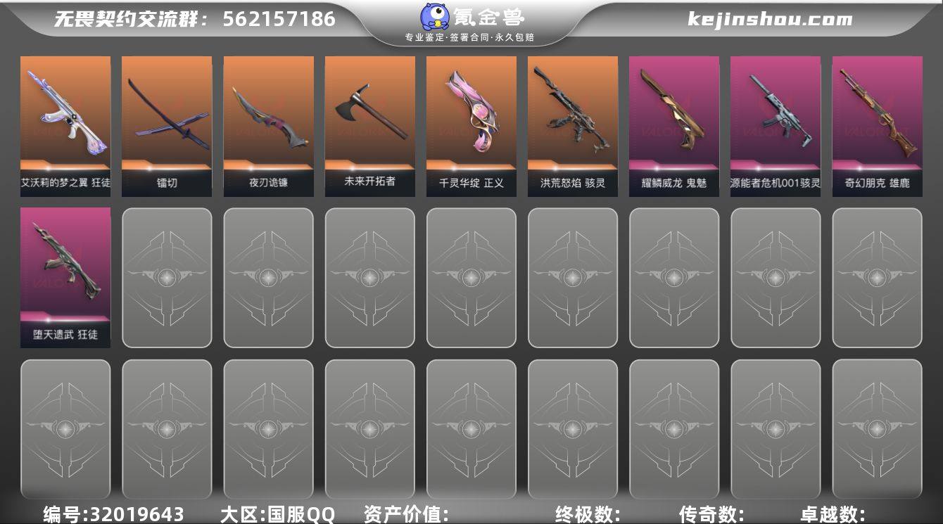 [17319732]27橙皮 4金皮 12紫皮 113皮肤 27英雄 120卡面 1230已用源晶 铂金段位 【套装】西部未来,2025全球冠军赛,掠影2.0套装 【近战武器皮肤】夜刃诡镰,荒土机兵热能刀,蝴蝶刀-奇点//2.0,影钩,星际猎兵 短剑,日耀风暴 遗器,诡秘蛇影,未来开拓者,神圣领域 战刀,镭切,2025全球冠军赛 蝴蝶刀,碎心裂刃 【佩枪皮肤】正义-西部未来,鬼魅-掠影2.0,标配-VCT25xBLG,正义-千灵华绽,鬼魅-耀鳞威龙,标配-源能者危机001 【冲锋枪皮肤】骇灵-掠影2.0,骇灵-源能者危机001,骇灵-洪荒怒焰 【霰弹枪皮肤】雄鹿-奇幻朋克 【步枪皮肤】幻影-西部未来,狂徒-上古龙炎,幻影-归零者//2.0,狂徒-奇点//2.0,幻影-电音光谱,多弥尔的复仇 狂徒,狂徒-ORAx颗秒,2025全球冠军赛 狂徒,幻影-掠影2.0,狂徒-光荣异象,狂徒-混沌序曲,狂徒-艾沃莉的梦之翼,狂徒-盖亚的复仇,狂徒-堕天遗武,幻影-离子武器,幻影-源能者娱乐系统,戍卫-天界神兵 【狙击枪皮肤】飞将-西部未来 【机枪皮肤】奥丁-掠影2.0,奥丁-西部未来,战神-光明哨兵 【挂饰】2025全球冠军赛挂饰,V26第一幕纪念币 挂饰,VCTxBLG挂饰,西部未来挂饰,金属蝶翼挂饰,双城之战小蛋糕挂饰,神中神挂饰,打不烂的挂饰,传世莲华挂饰