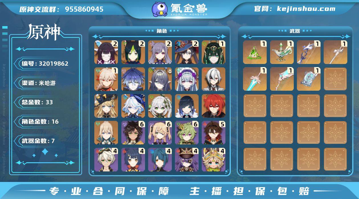 邮箱: 不送邮/死邮 总黄数: 33 冒险等级: 57 2命金色角色: 二命刻晴,二命莫娜,二命提纳里,二命哥伦比娅 1命金色角色: 一命枫原万叶,一命奈芙尔 0命金色角色: 迪卢克,琴,夜兰,纳西妲,芙宁娜,娜维娅,阿蕾奇诺,梦见月瑞希,菈乌玛,菲林斯 拥有武器: 天空之翼,四风原典,天空之傲,风鹰剑,若水,千夜浮梦,真语秘匣 1精武器: 天空之翼,四风原典,天空之傲,风鹰剑,若水,千夜浮梦,真语秘匣