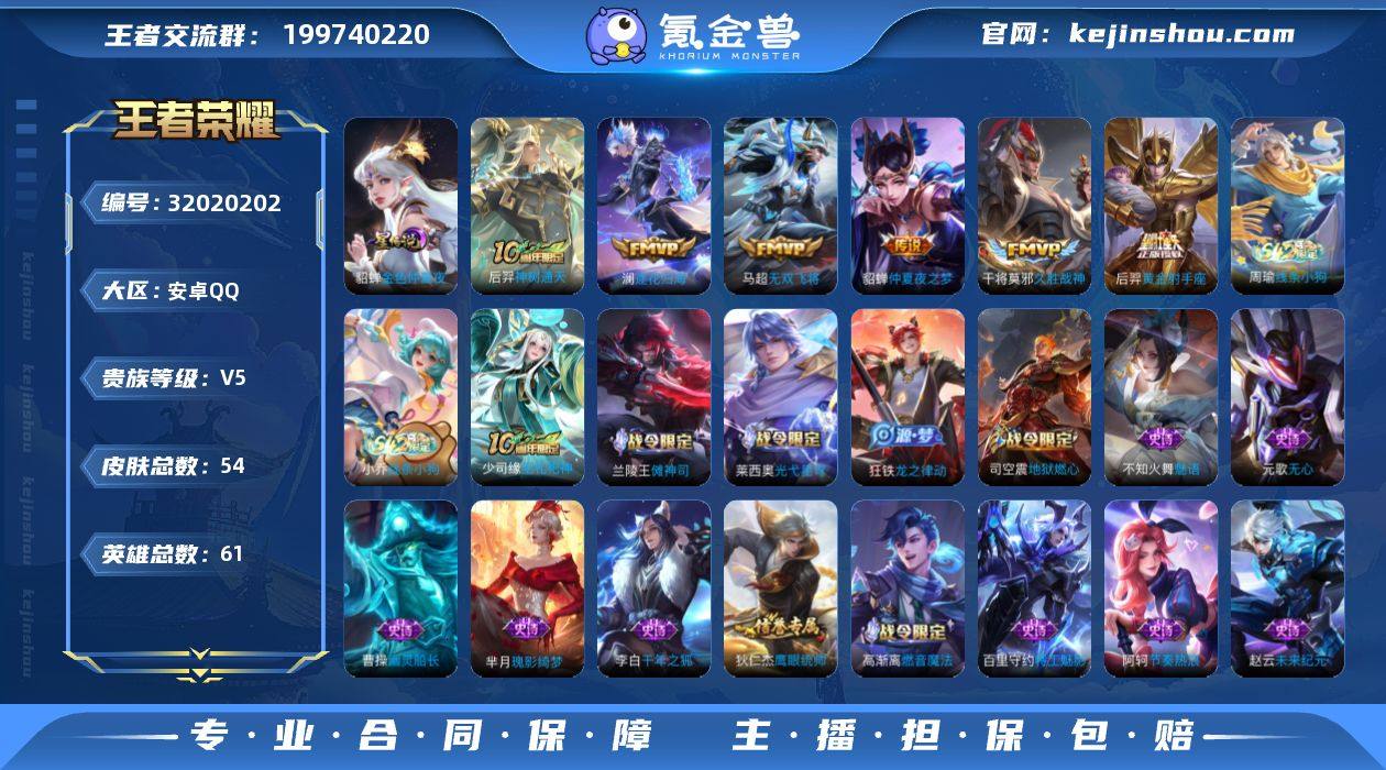 安卓Q-V5-至尊星耀II段位-61英雄-54皮肤-7传说-23史诗【传说皮肤】:马超神骥逐星野,后羿神树通天,澜逐花归海,马超无双飞将,干将莫邪久胜战神,后羿黄金射手座,貂蝉仲夏夜之梦【限定皮肤】:虞姬夏日便利店,狄仁杰阴阳师,赵云皇家上将,元歌无心,项羽海滩派对,米莱狄胡桃异想国,司空震地狱燃心,高渐离燃音魔法,沈梦溪龙舞盛年【赛季限定】:亚瑟荣光之誓【战令限定】:米莱狄胡桃异想国,司空震地狱燃心,高渐离燃音魔法,虞姬夏日便利店,兰陵王傩神司,莱西奥光弋星穹,明世隐往忆晖光,周瑜线条小狗,小乔线条小狗【史诗皮肤】:周瑜线条小狗,小乔线条小狗,少司缘巫礼祀神,兰陵王傩神司,莱西奥光弋星穹,狂铁龙之律动,芈月瑰影绮梦,高渐离燃音魔法,司空震地狱燃心,元歌无心,沈梦溪月团寄思,米莱狄胡桃异想国,不知火舞魅语,狄仁杰鹰眼统帅,阿轲节奏热浪,百里守约特工魅影,雅典娜冰冠公主,亚瑟心灵战警,李白千年之狐,曹操幽灵船长,妲己魅力维加斯,孙尚香水果甜心,赵云未来纪元,赵云皇家上将【其他皮肤】:鲁班七号班班快跑,妲己线条小狗,蒙恬苍云破阵,安琪拉糖果风暴,虞姬溯影追猎,蚩奼极光幻客,曹操逐霄之志,艾琳鹤鸣心笺,明世隐往忆晖光,亚瑟荣光之誓,虞姬夏日便利店,沈梦溪龙舞盛年,牛魔牛运亨通,李白敏锐之力,狄仁杰阴阳师,亚瑟死亡骑士,赵云忍炎影,韩信街头霸王,项羽海滩派对,司马懿魇语军师,马可波罗激情绿茵,孙悟空西部大镖客,貂蝉异域舞娘【营地ID】:1566708956【星元皮肤】:貂蝉金色仲夏夜