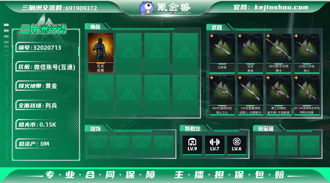 实名: 不可修改 烽火地带段位: 黄金 全面战场段位: 列兵 总资产: 225 哈夫币: 156 干员外观: 无名-夜鹰(S4) 传说武器皮肤: SR-25射手步枪-水墨云图,AS Val突击步枪-蛇年祥瑞,QJB201轻机枪-黑海,MP5冲锋枪-黑海,近战-黑海,SMG45冲锋枪-骑士,近战-北极星,K437突击步枪-北极星,QCQ171冲锋枪-北极星,725双管霰弹枪-送葬人-无题密令,M4A1突击步枪-阿米娅,CAR-15突击步枪-阿米娅,复合弓-黑-天际线,Vector冲锋枪-狩猎时刻,G3战斗步枪-狩猎时刻,M16A4突击步枪-狩猎时刻,AK-12突击步枪-特斯拉线圈,SR-3M紧凑突击步枪-特斯拉线圈,UZI冲锋枪-特斯拉线圈,勇士冲锋枪-能天使-午夜邮差,M250通用机枪-骑士之心,G3战斗步枪-骑士,SKS射手步枪-骑士 亮点: 【优质装备】:近战-黑海,近战-北极星